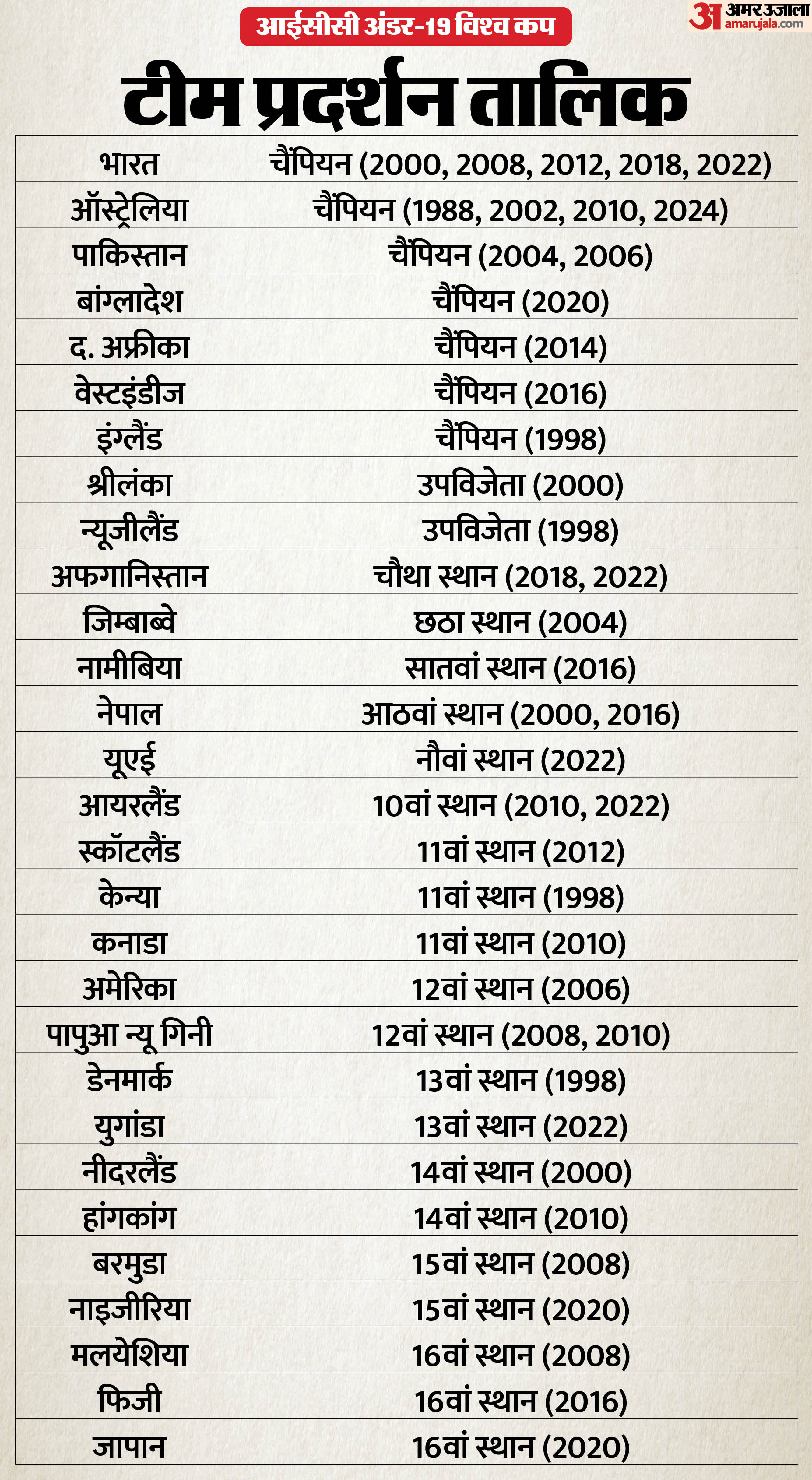 पिछला संस्करण 2024 में ऑस्ट्रेलिया ने भारत को हराकर खिताब जीता था। वहीं, भारत सबसे ज्यादा बार पांच यह खिताब जीत चुका है। ऑस्ट्रेलिया कुल मिलाकर चार बार चैंपियन रह चुका है। वहीं, पाकिस्तान दो बार और वेस्टइंडीज, दक्षिण अफ्रीका, बांग्लादेश और इंग्लैंड ने एक-एक बार यह खिताब जीता है। इस बार 16 टीमें फिर से खिताब की लड़ाई में होंगी और युवा खिलाड़ियों के बीच कड़ी टक्कर देखने को मिलेगी।