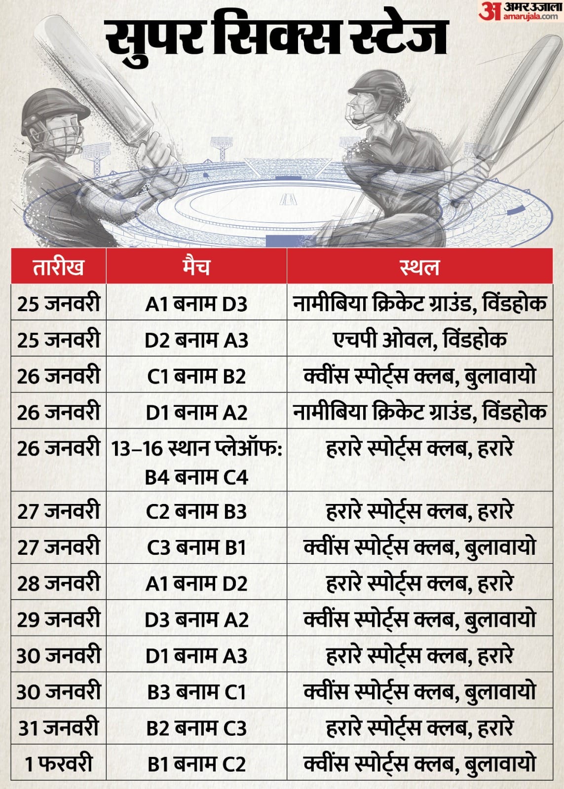 - ग्रुप-बी+ ग्रुप-सी की टॉप-तीन टीमें दूसरा सुपर सिक्स ग्रुप बनाएंगी।
