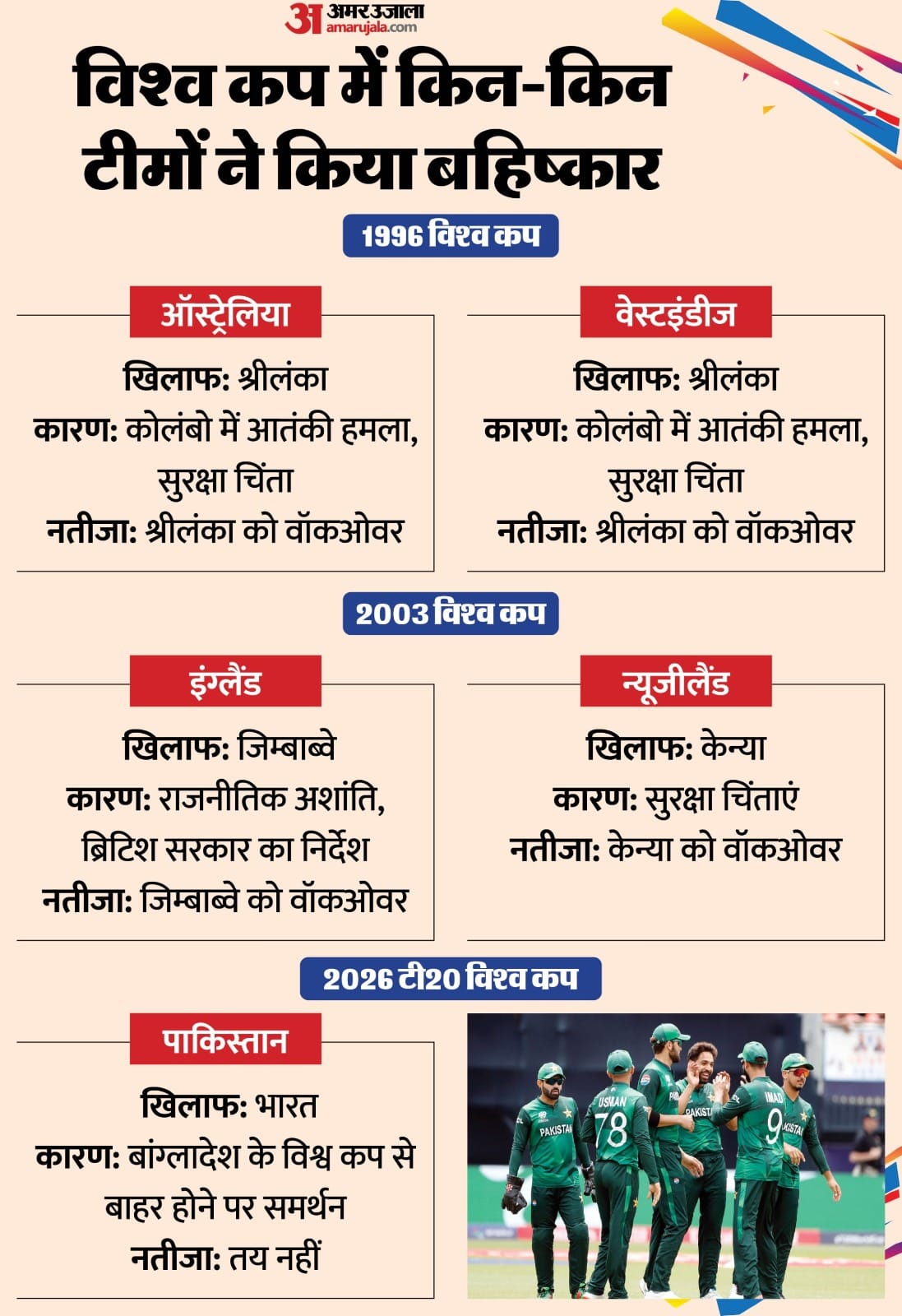 पाकिस्तान की सरकार ने एलान किया है कि उनकी टी20 विश्व कप में भारत के खिलाफ खेले जाने वाले ग्रुप मुकाबले का बहिष्कार करेगी। इसके पीछे उनकी तरफ से कारण भी स्पष्ट नहीं किया गया है। हम यहां आपको बताएंगे कि ऐसा पहले कब-कब हुआ है, जब किसी टीम ने विश्व कप मुकाबले में खेलने से इनकार किया है।