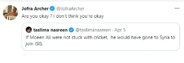 आर्चर मंगलवार को तब भड़क गए जब तस्लीमा नसरीन ने इंग्लैंड के खिलाड़ी मोईन अली पर आपत्तिजनक ट्वीट करते हुए उन्हें आतंकवादी संगठन से जोड़ने की कोशिश की। तसलीमा ने ट्वीट किया था कि इंग्लैंड का यह ऑलराउंडर अगर क्रिकेट नहीं खेल रहा होता तो इसने आईएसआईएस जॉइन कर लिया होता।