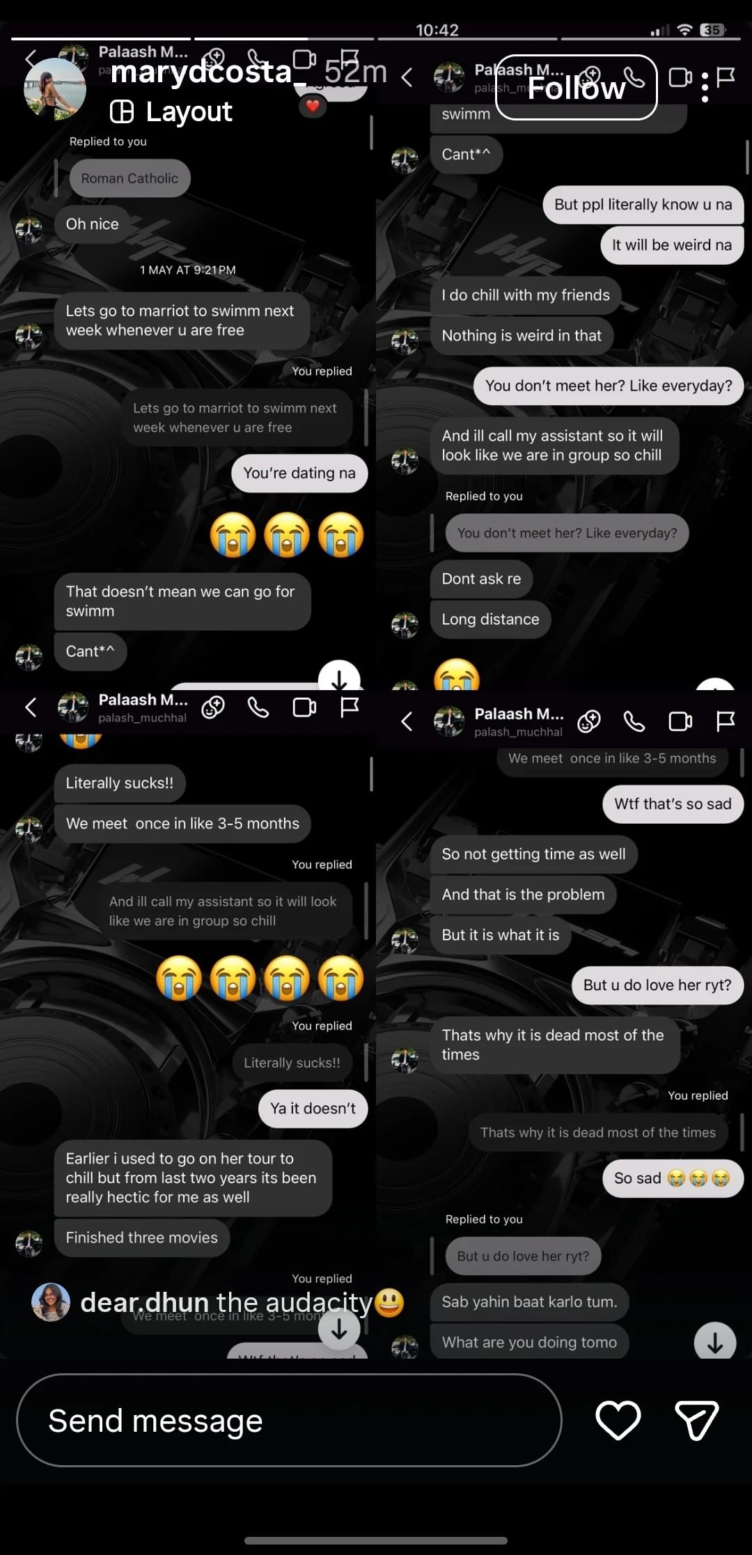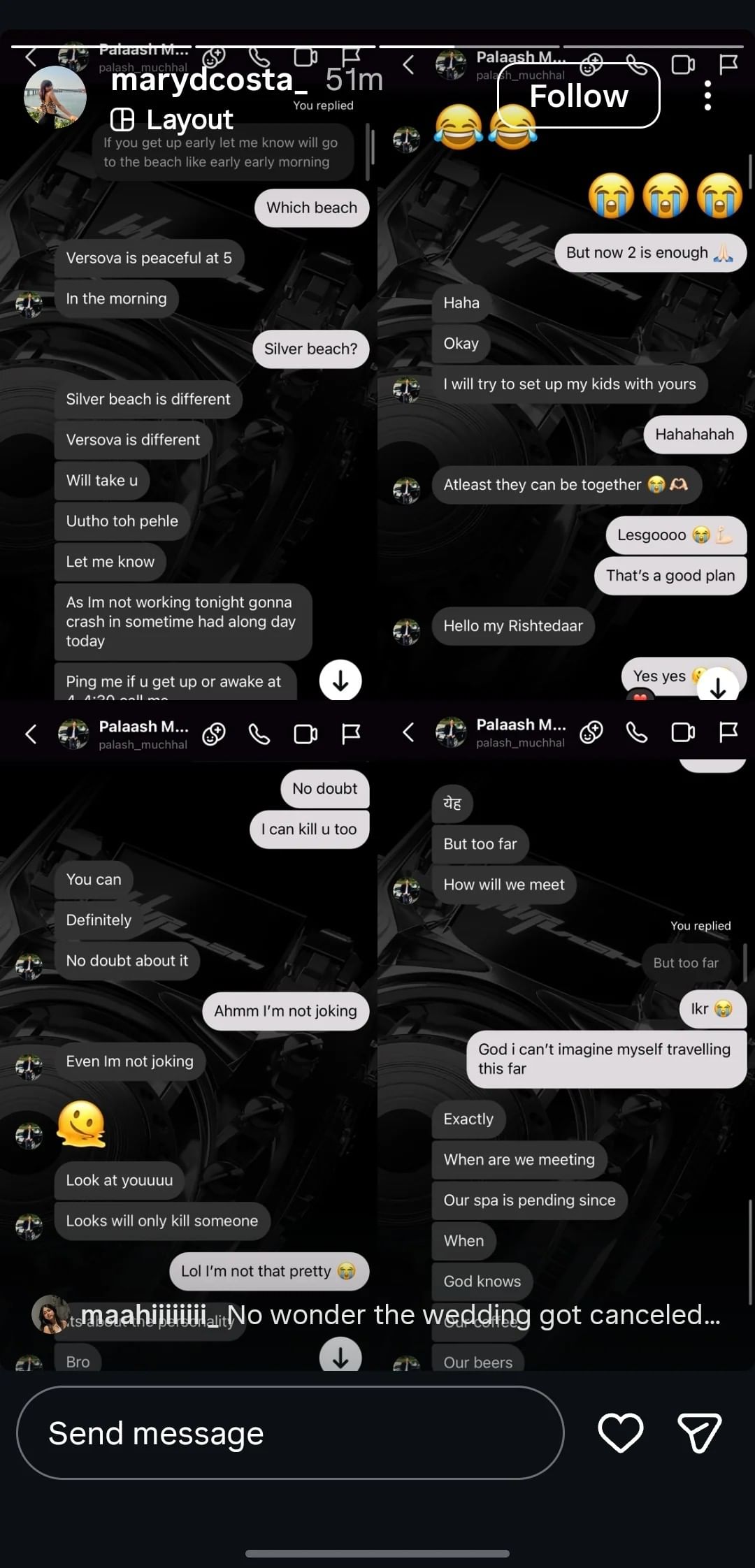 स्थिति तब और उलझ गई, जब सोशल मीडिया प्लेटफॉर्म रेडिट पर एक यूजर ने कथित चैट्स के स्क्रीनशॉट साझा कर दिए गए। इसमें दावा किया गया कि यह चैट पलाश और एक महिला मैरी डी कॉस्टा के बीच के हैं। (अमर उजाला इसकी सत्यता की पुष्टि नहीं करता।) हालांकि, अब वह अकाउंट और प्रोफाइल पिक्चर डिलीट हो चुका है, लेकिन चैट्स तेजी से इंटरनेट पर वायरल गए। स्क्रीनशॉट्स में कथित तौर पर दिख रहा है कि ये मई 2025 की चैट्स हैं। इसमें पलाश नाम के इंस्टाग्राम अकाउंट से महिला को चैट भेजा गया है, जिसमें वो तैराकी करने और मिलने की बात कर रहे हैं।