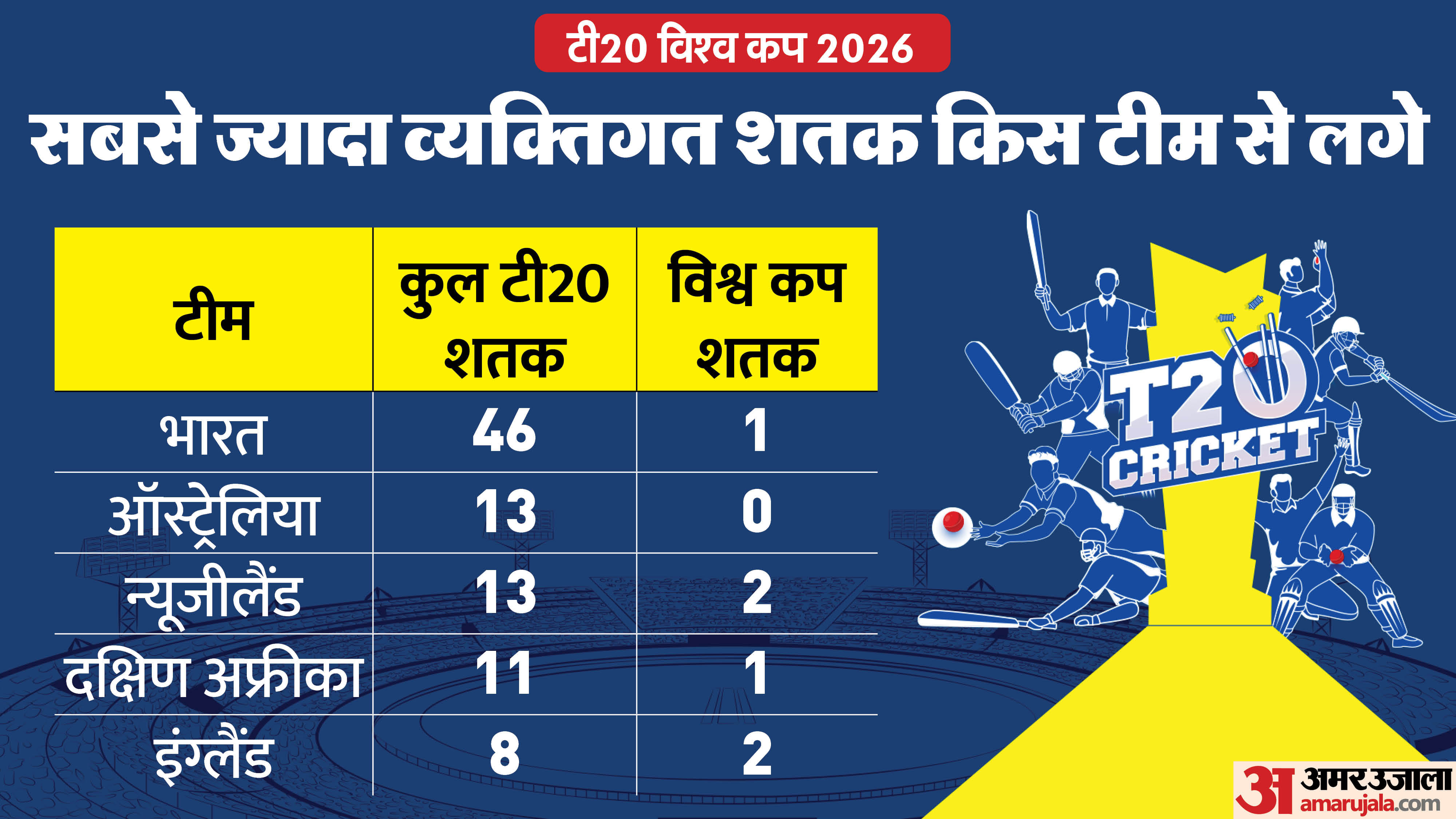 अब तक भारत के बल्लेबाज टी20 अंतरराष्ट्रीय क्रिकेट में 25 शतक लगा चुके हैं। इस मामले में ऑस्ट्रेलिया और न्यूजीलैंड संयुक्त रूप से दूसरे स्थान पर हैं, जिनके बल्लेबाजों ने 13-13 शतक जमाए हैं। हालांकि टी20 विश्व कप, की बात करें तो तस्वीर थोड़ी अलग नजर आती है। विश्व कप इतिहास में इंग्लैंड और न्यूजीलैंड के बल्लेबाजों ने सबसे ज्यादा दो-दो शतक लगाए हैं। वहीं भारत और दक्षिण अफ्रीका के खिलाड़ियों ने सिर्फ एक-एक शतक ही लगाए हैं।