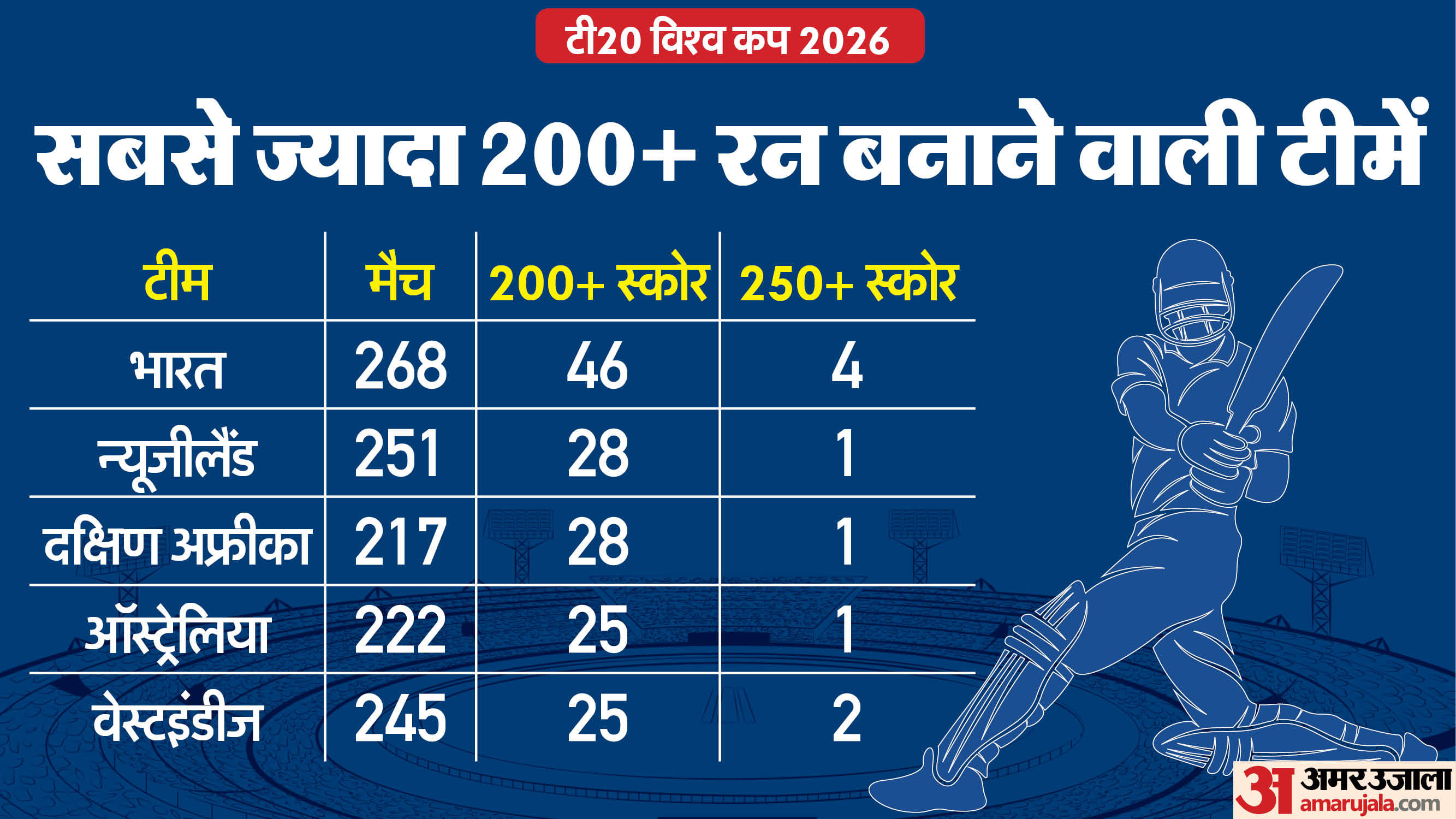 टी20 क्रिकेट में इस पैमाने पर भी टीम इंडिया सबसे आगे है। भारत ने अब तक 46 बार 200 या उससे अधिक रन का स्कोर खड़ा किया है। इतना ही नहीं, भारतीय टीम चार बार 250 से ज्यादा रन भी बना चुकी है, जो उसकी आक्रामक बल्लेबाजी की ताकत को दर्शाता है।