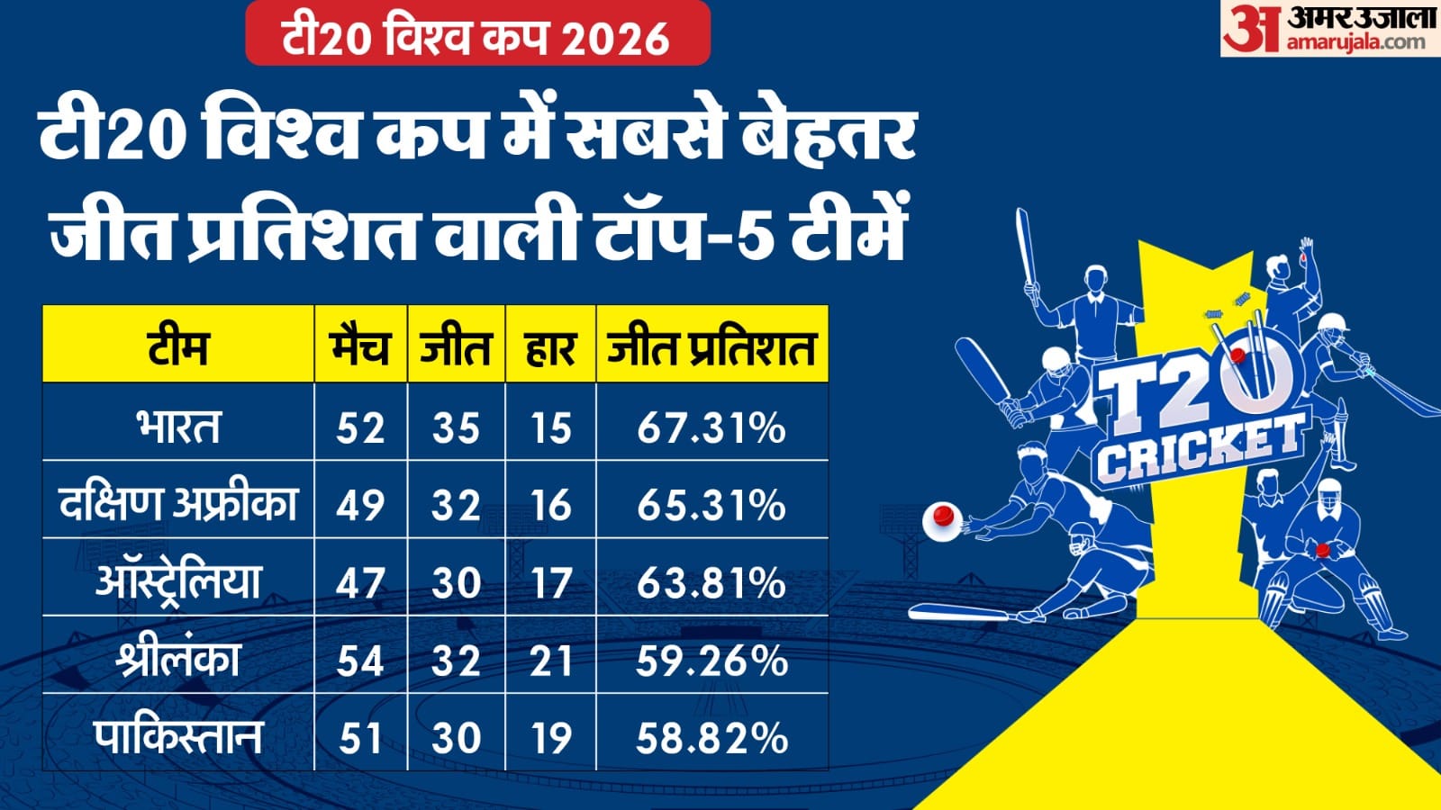 अब तक खेले गए नौ टी20 विश्व कप में शीर्ष-आठ की लगभग सभी टीमों ने 45 से 55 मुकाबले खेले हैं। इन सभी टीमों के प्रदर्शन की तुलना करें तो टीम इंडिया का जीत प्रतिशत सबसे बेहतर रहा है। भारत ने 52 मैचों में से 35 मुकाबले जीते, जिससे उसका जीत प्रतिशत लगभग 67 प्रतिशत बनता है। इस मामले में भारत सभी टीमों से आगे है।
