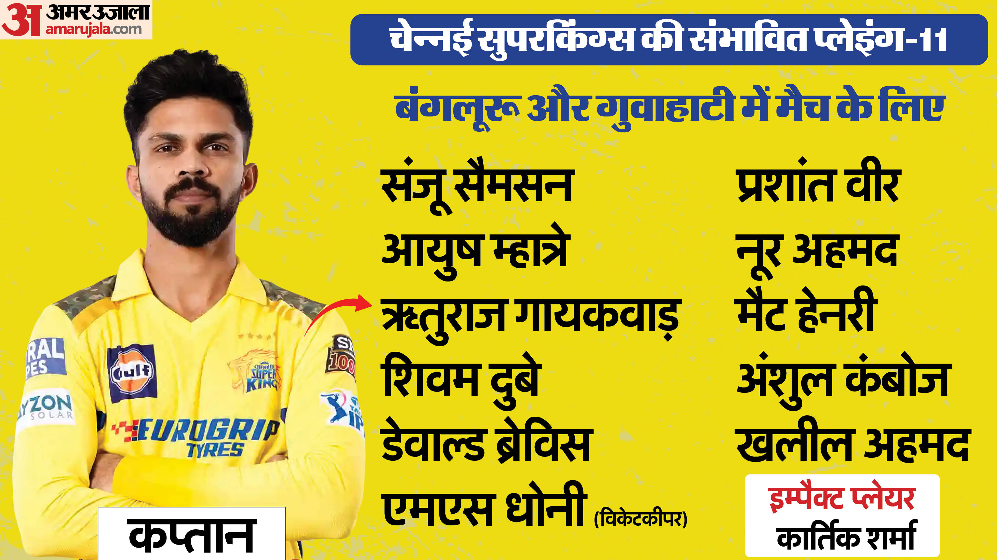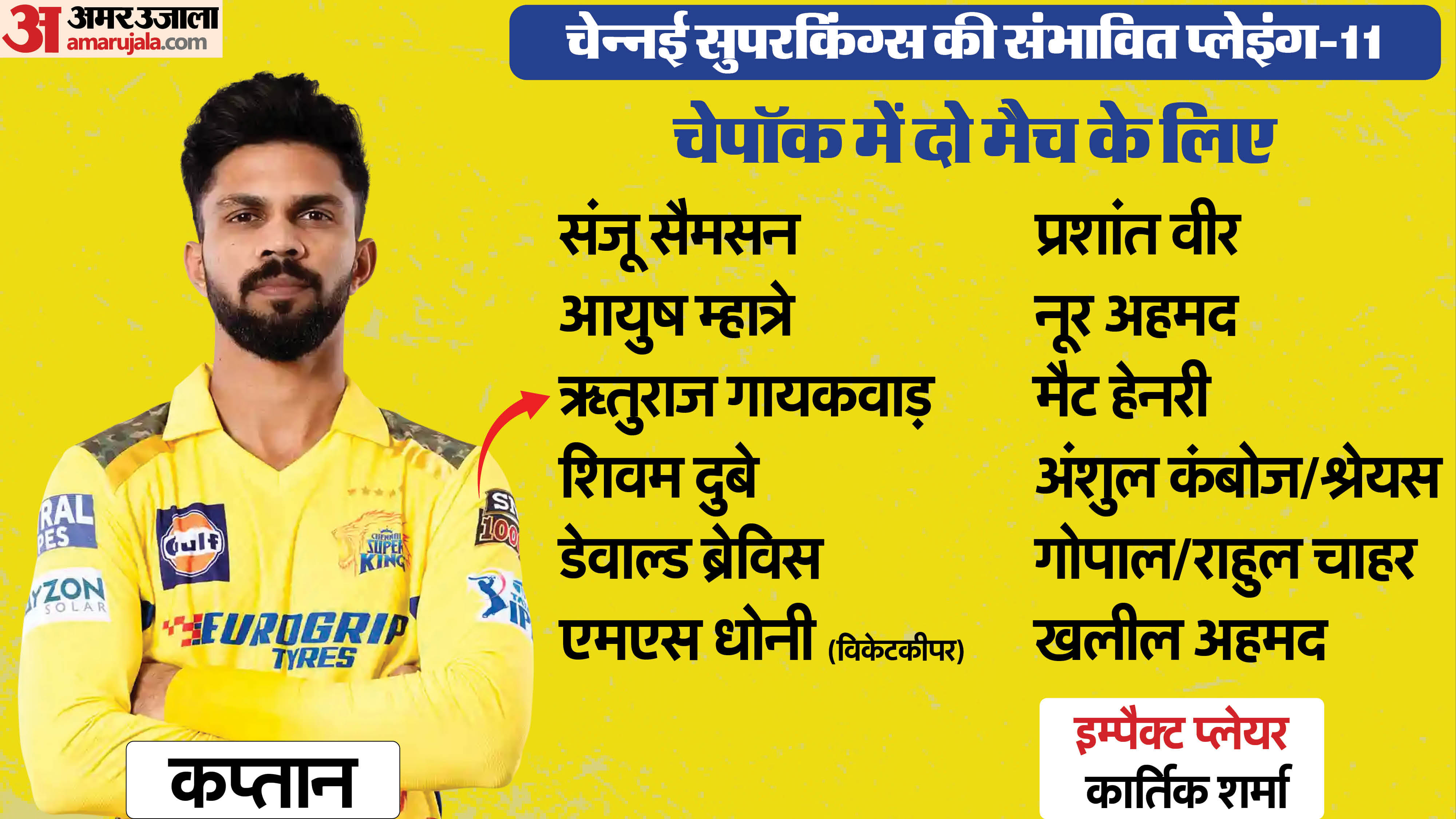 अगर सीएसके अगर पहले बल्लेबाजी करता है तो अंशुल को खलील पर तरजीह दी जा सकती है और शुरुआती प्लेइंग-11 में शामिल किया जा सकता है। ऐसा इसलिए क्योंकि वह बल्लेबाजी भी लेते हैं। खलील को इम्पैक्ट प्लेयर के तौर पर लाया जा सकता है। वहीं, अगर सीएसके की पहले गेंदबाजी आती है तो किसी एक बल्लेबाज को बैठाकर अंशुल और खलील दोनों को मौका दिया जा सकता है।