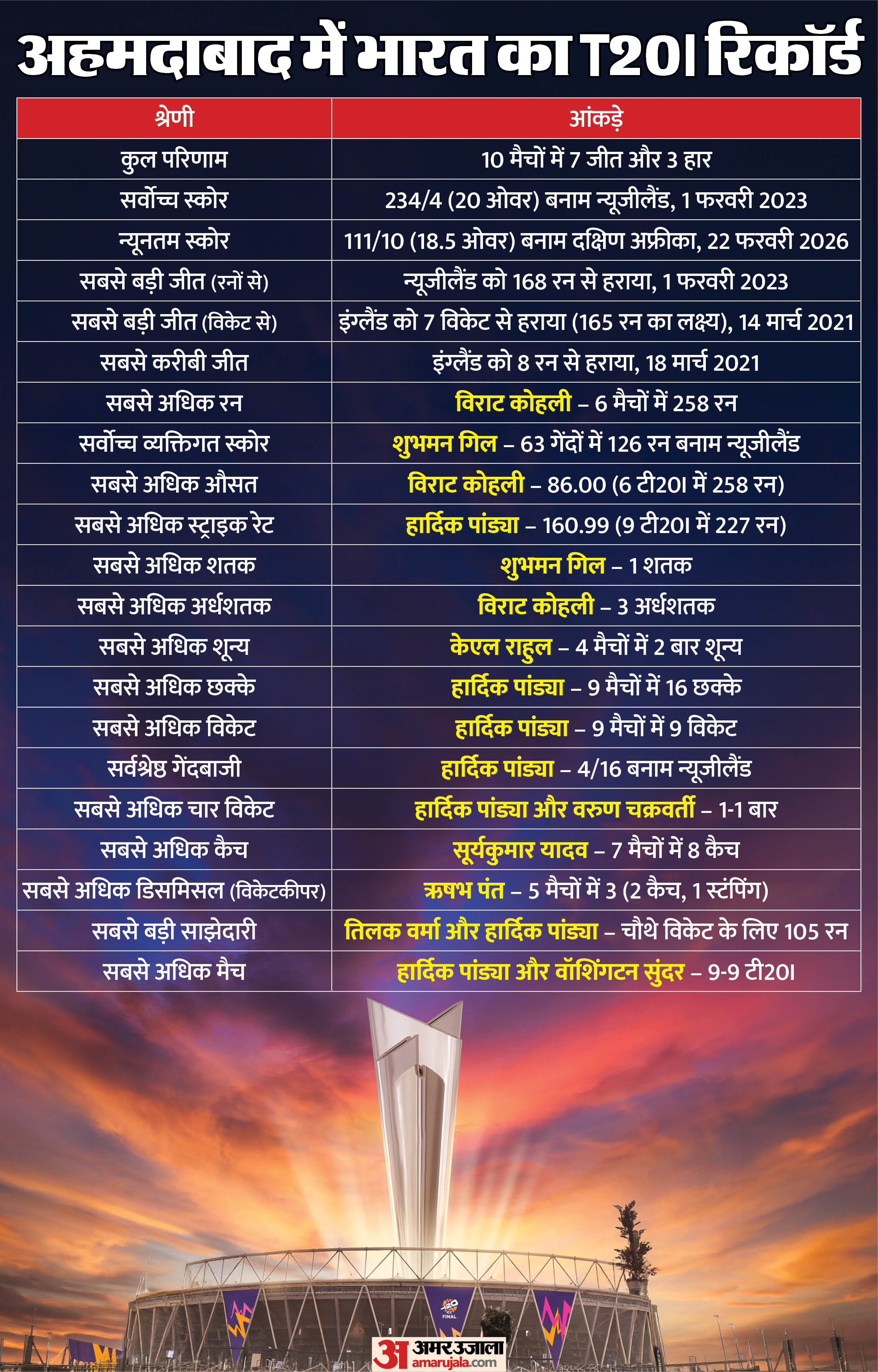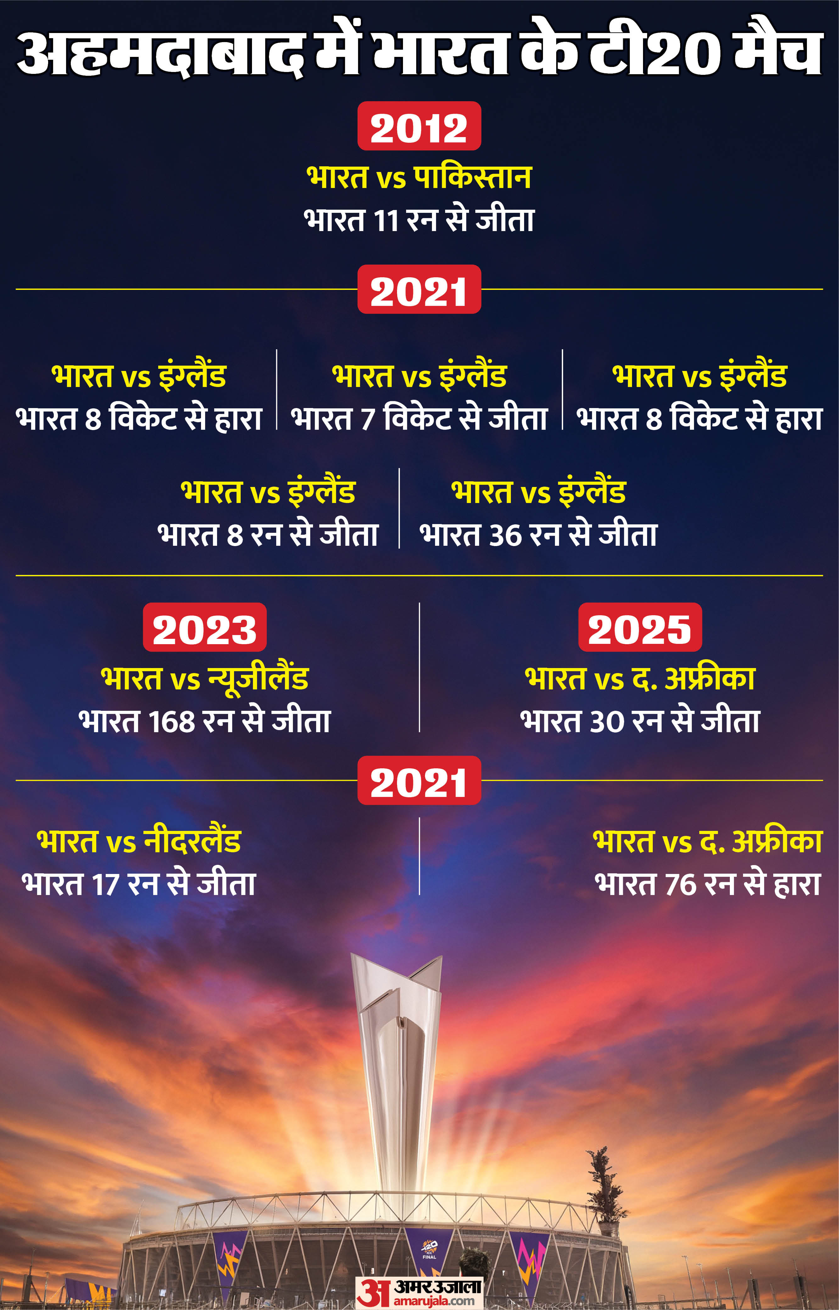 भारतीय क्रिकेट टीम को टी20 विश्व कप 2026 का फाइनल रविवार को अहमदाबाद के नरेंद्र मोदी स्टेडियम में न्यूजीलैंड के खिलाफ खेलना है। इस स्टेडियम में भारतीय टीम का हालिया रिकॉर्ड अच्छा नहीं रहा है। वनडे विश्व कप 2023 के फाइनल में ऑस्ट्रेलिया से मिली हार भारतीय फैंस अब भी नहीं भूले हैं। वहीं जारी टी20 विश्व कप में भी सुपर-8 के पहले मुकाबले में भारतीय टीम को दक्षिण अफ्रीका के खिलाफ अपनी पहली हार का सामना करना पड़ा था।