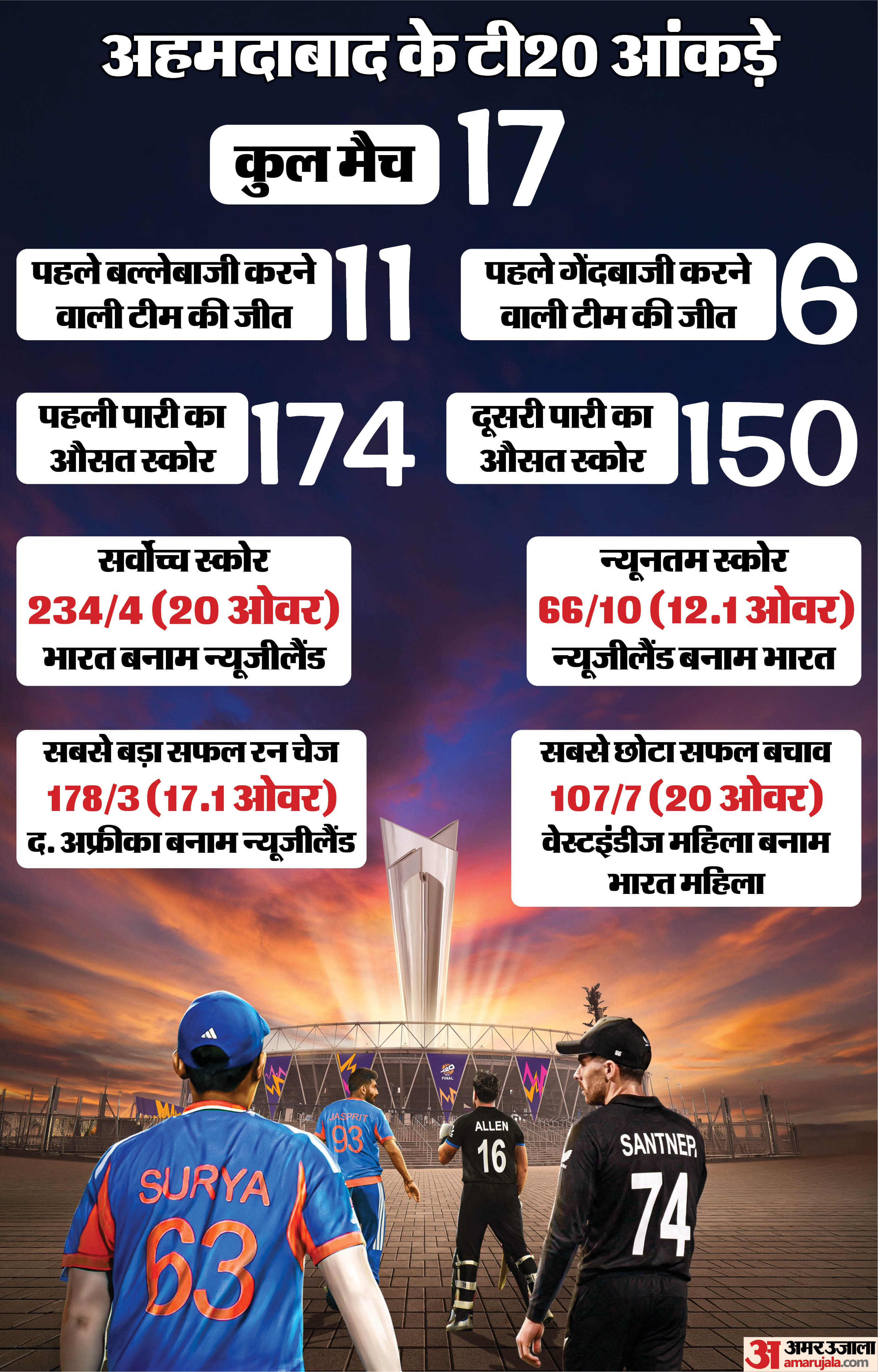इस टूर्नामेंट में दोनों टीमों ने अहमदाबाद में मैच खेले हैं। भारत ने ग्रुप मैच में नीदरलैंड को 17 रन से हराया था, लेकिन सुपर-8 में दक्षिण अफ्रीका के खिलाफ 76 रन से हार झेलनी पड़ी। दूसरी ओर न्यूजीलैंड को भी यहां दक्षिण अफ्रीका के खिलाफ सात विकेट से हार का सामना करना पड़ा था। इस तरह दोनों टीमों के लिए यह मैदान मिश्रित अनुभव लेकर आया है।