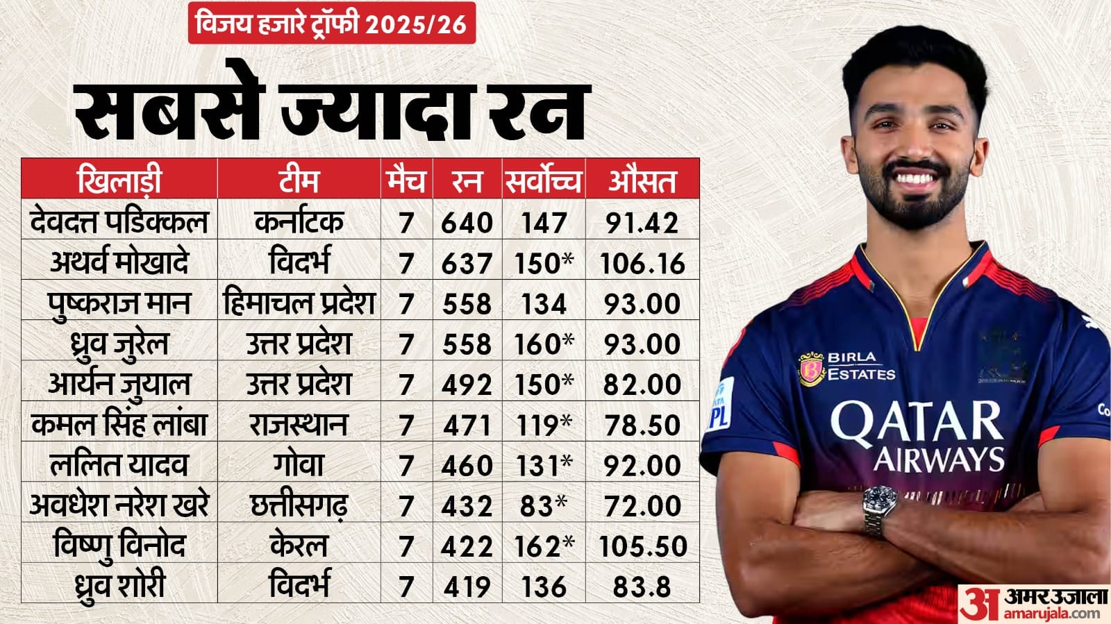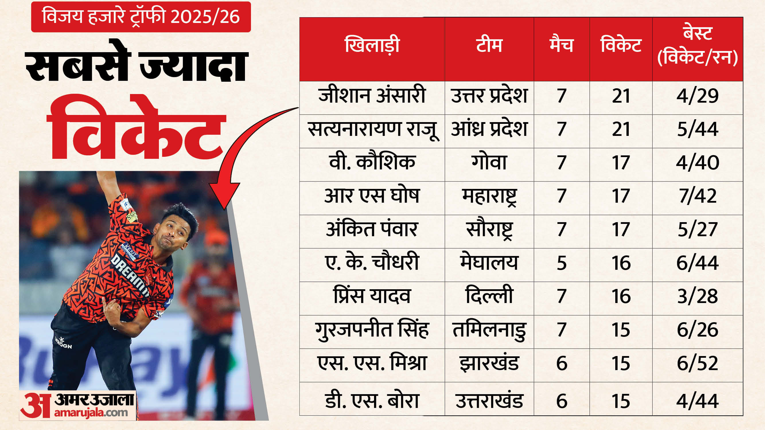 टी20 विश्व कप 2026 के लिए भारतीय टीम का एलान हो चुका है और फैंस की नजरें उन खिलाड़ियों की हालिया फॉर्म पर टिकी हुईं हैं, जो इस बड़े टूर्नामेंट में देश का प्रतिनिधित्व करेंगे। ऐसे में विजय हजारे ट्रॉफी 2025/26 का प्रदर्शन उनके फॉर्म का एक अहम संकेत देता है। बल्लेबाजी हो या गेंदबाजी, कुछ खिलाड़ियों ने दमदार प्रदर्शन किया तो कुछ उम्मीदों पर खरे नहीं उतर सके।