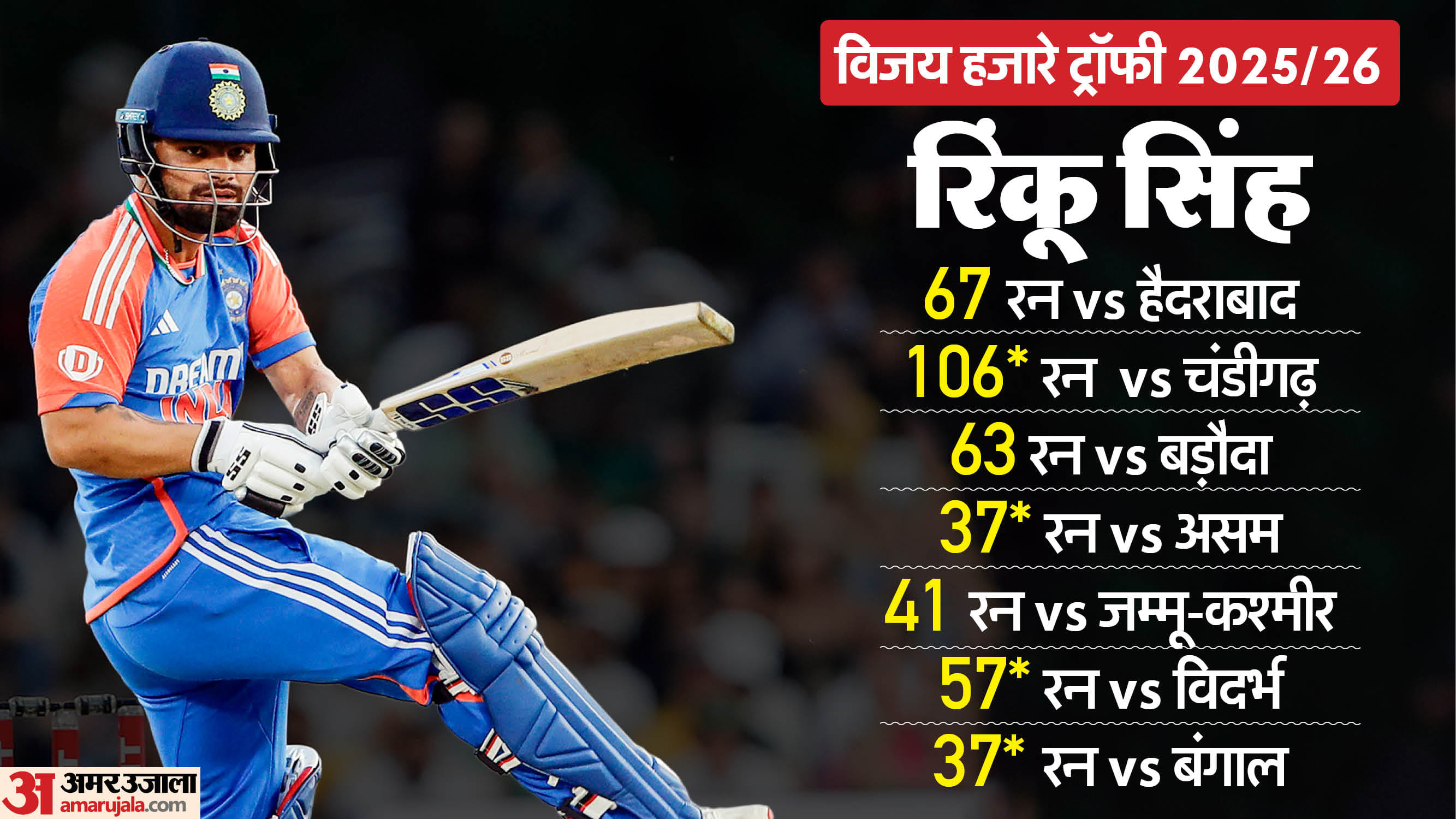 भारत के भरोसेमंद फिनिशर रिंकू सिंह ने विजय हजारे टूर्नामेंट में एक बार फिर अपनी क्लास साबित की। हैदराबाद के खिलाफ 67, चंडीगढ़ के खिलाफ 106*, बड़ौदा के खिलाफ 63, असम के खिलाफ 37*, जम्मू-कश्मीर के खिलाफ 41, विदर्भ के खिलाफ 57* और बंगाल के खिलाफ 37* जैसी पारियों ने उनका रिपोर्ट कार्ड बेहद प्रभावी बना दिया। यह स्पष्ट है कि रिंकू टी20 विश्व कप में भारत का ट्रम्प कार्ड साबित हो सकते हैं।