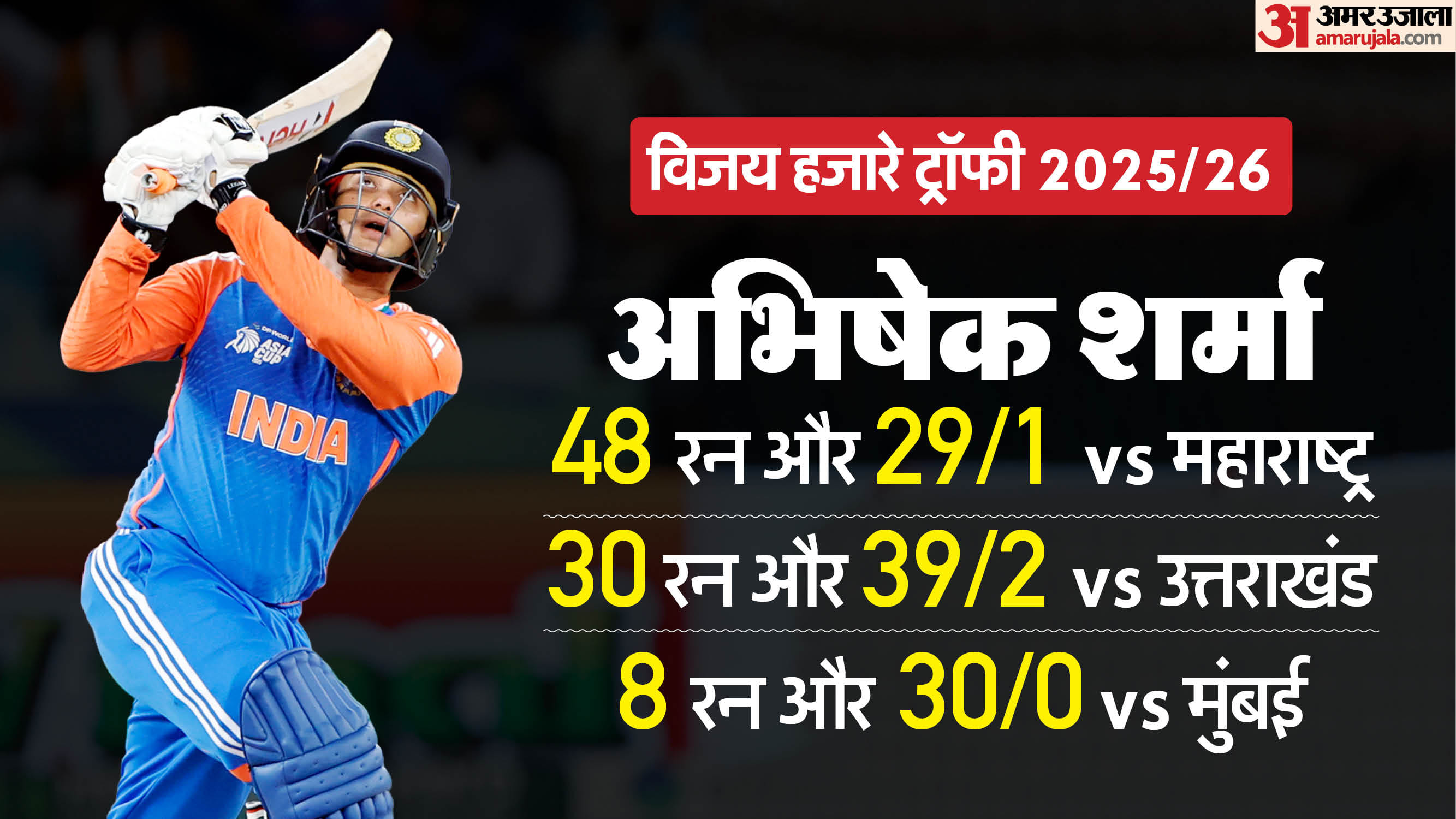 • अभिषेक शर्मा ने महाराष्ट्र के खिलाफ 48 रन बनाए और एक विकेट लिया, उत्तराखंड के खिलाफ 30 रन बनाए और दो विकेट लिया ऐसे में दोनों विभागों में उनका प्रदर्शन औसत रहा, लेकिन फिर मुंबई के खिलाफ वह आठ रन ही बना पाए और एक ओवर में 30 रन खर्च किए। हालांकि, टी20 विश्व कप में वह टीम इंडिया के सबसे अहम खिलाड़ी होंगे।