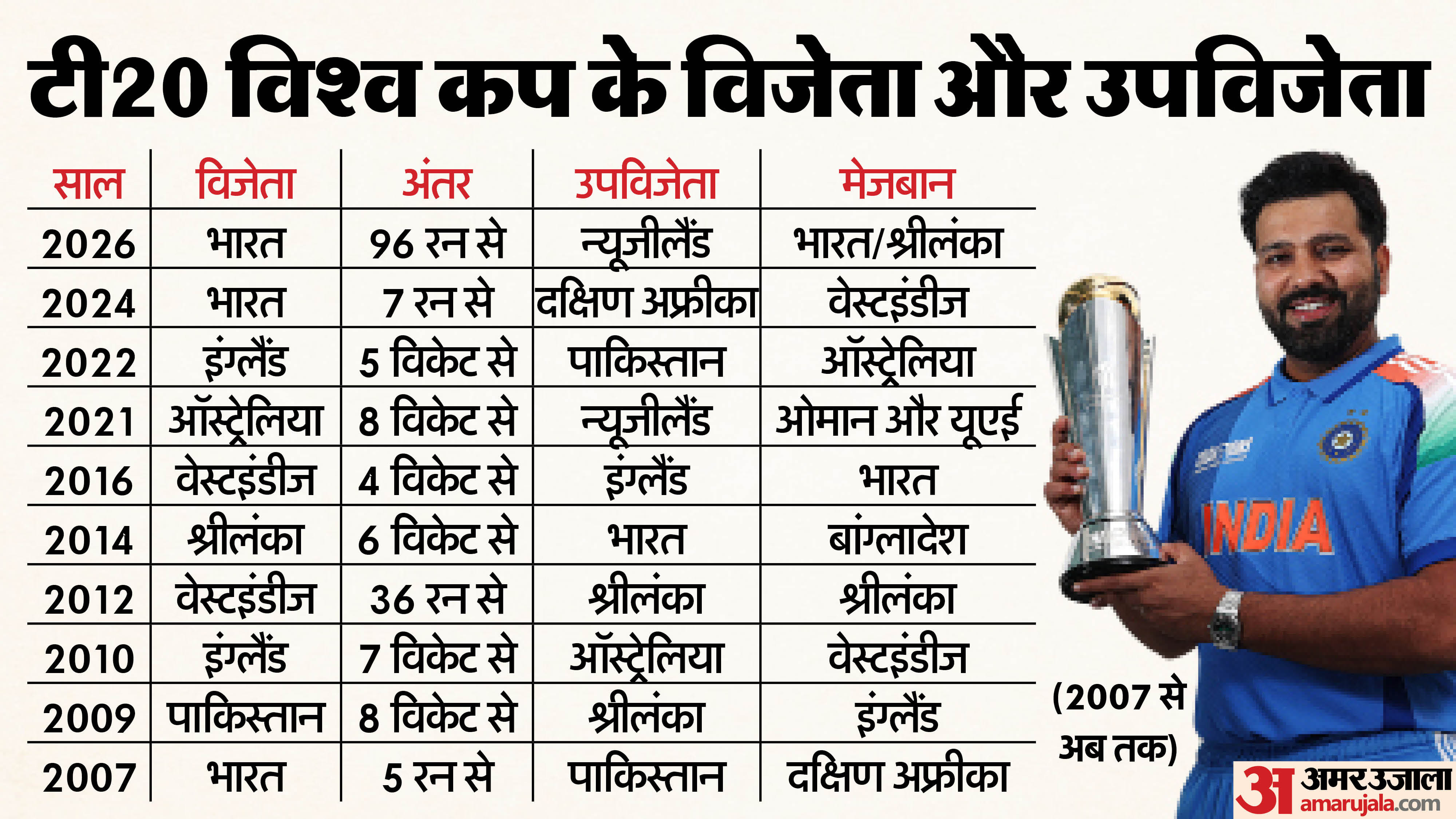 भारत की ऐतिहासिक जीत के साथ टी20 विश्व कप 2026 का समापन हो गया। टीम इंडिया ने अहमदाबाद के नरेंद्र मोदी स्टेडियम में न्यूजीलैंड को 96 रनों से हराकर खिताब अपने नाम किया। आईसीसी टी20 विश्वकप की शुरुआत साल 2007 में हुई थी। पहला संस्करण दक्षिण अफ्रीका में खेला गया था। तब से अब तक 10 संस्करण हो चुके हैं।
