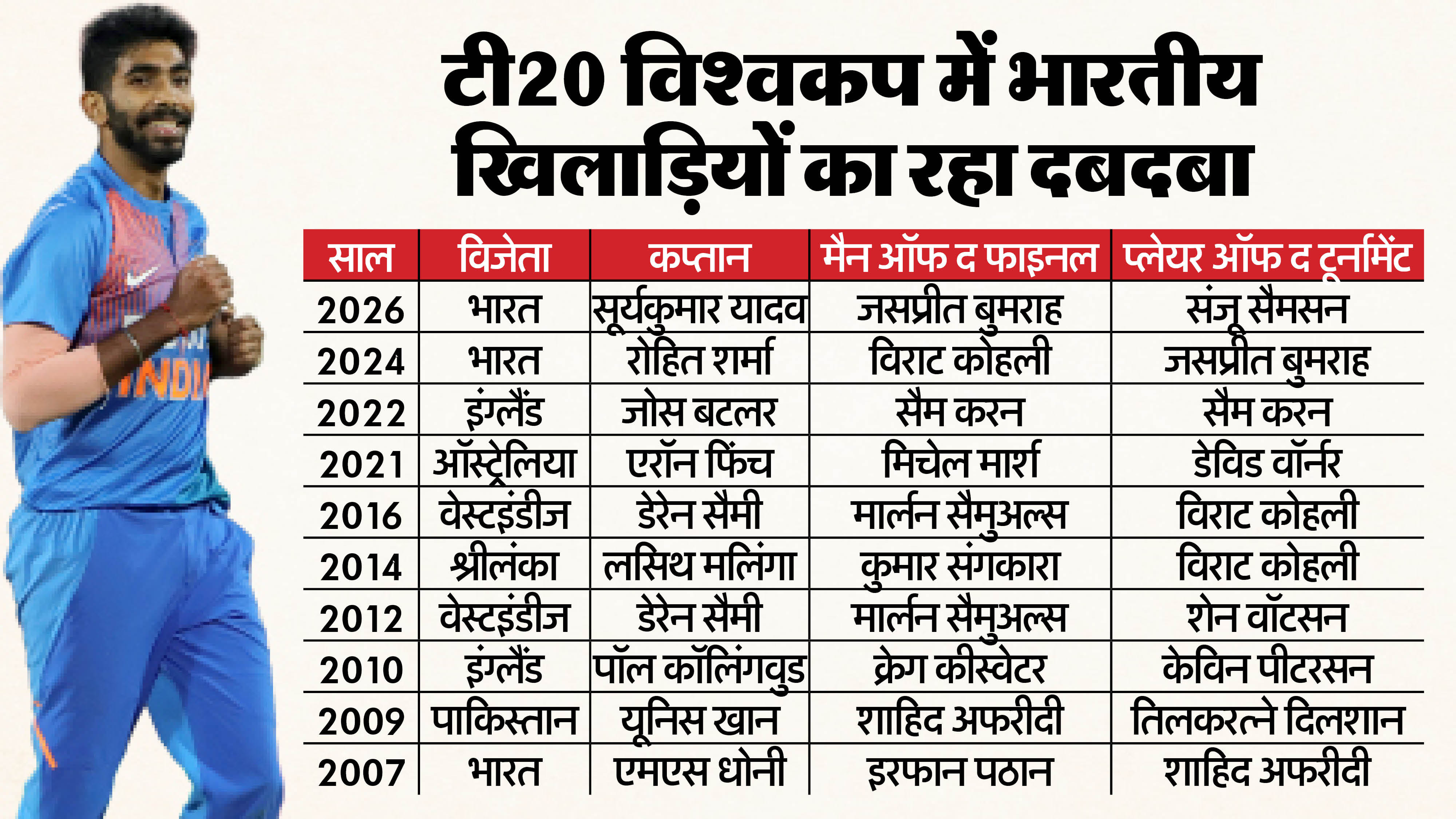 टी20 विश्वकप के इतिहास में भारत का योगदान बेहद खास रहा है। भारत ने तीन बार खिताब जीता, चार बार उसके खिलाड़ी प्लेयर ऑफ द टूर्नामेंट बने और कई फाइनल मुकाबलों में भारतीय सितारों ने हीरो बनकर टीम को गौरव दिलाया। विराट कोहली और जसप्रीत बुमराह जैसे खिलाड़ी इस फॉर्मेट में भारत की पहचान बन चुके हैं।