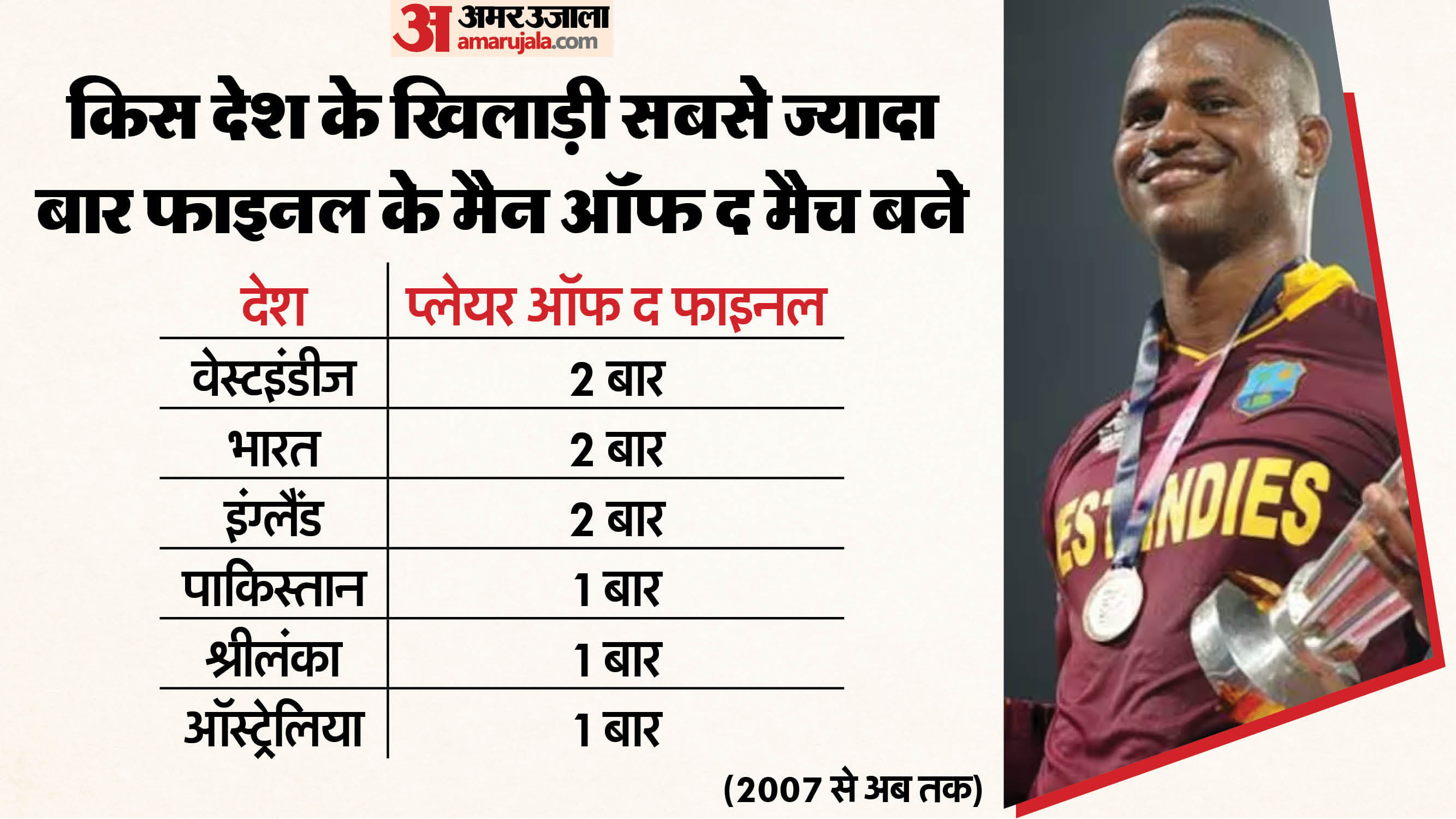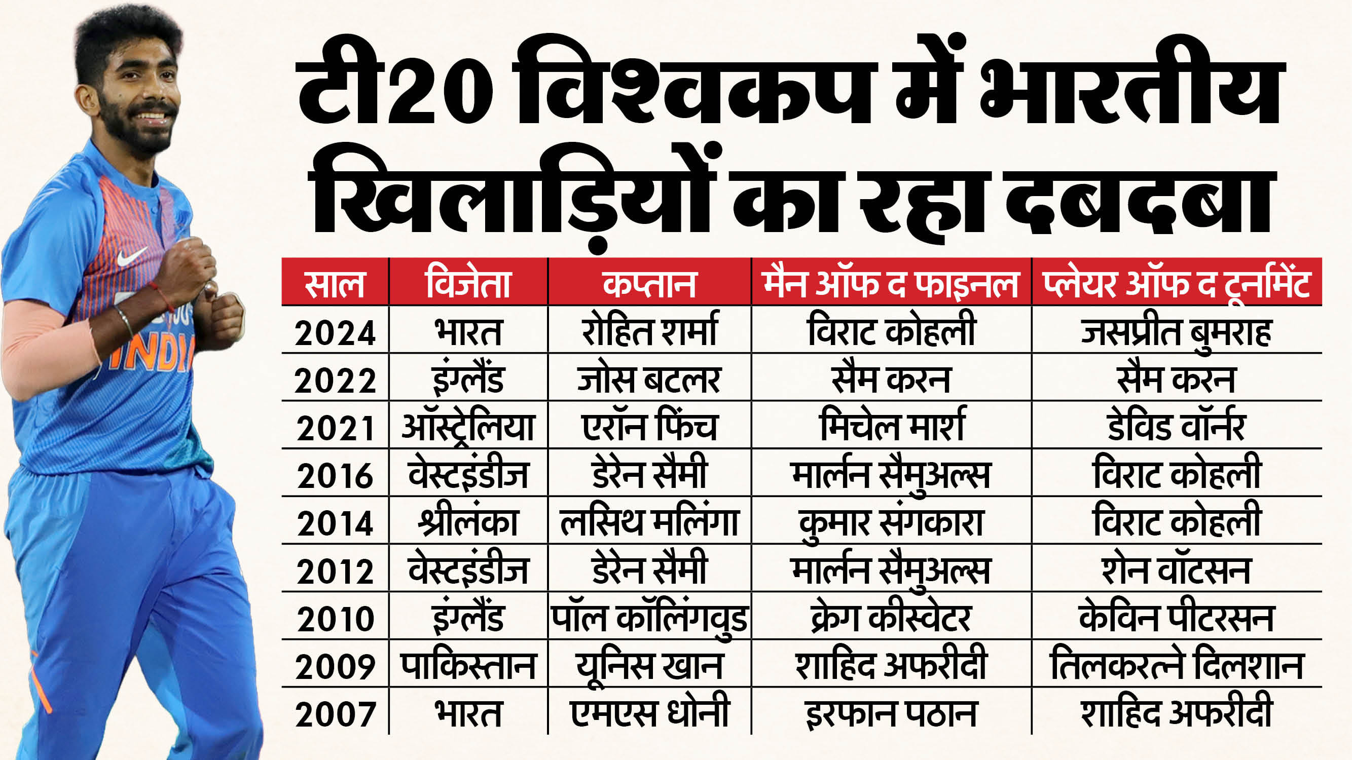 टी20 विश्वकप के इतिहास में भारत का योगदान बेहद खास रहा है। भारत ने दो बार खिताब जीता, चार बार उसके खिलाड़ी प्लेयर ऑफ द टूर्नामेंट बने और कई फाइनल मुकाबलों में भारतीय सितारों ने हीरो बनकर टीम को गौरव दिलाया। विराट कोहली और जसप्रीत बुमराह जैसे खिलाड़ी इस फॉर्मेट में भारत की पहचान बन चुके हैं।