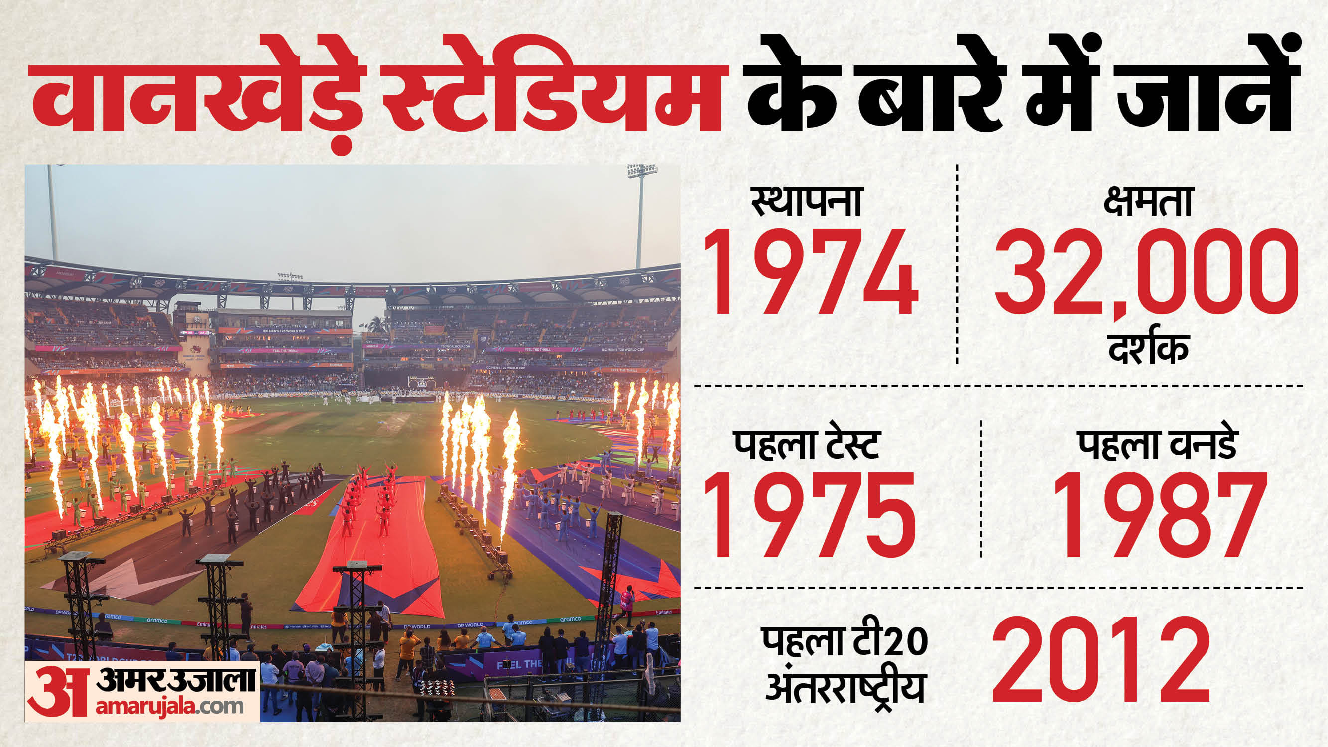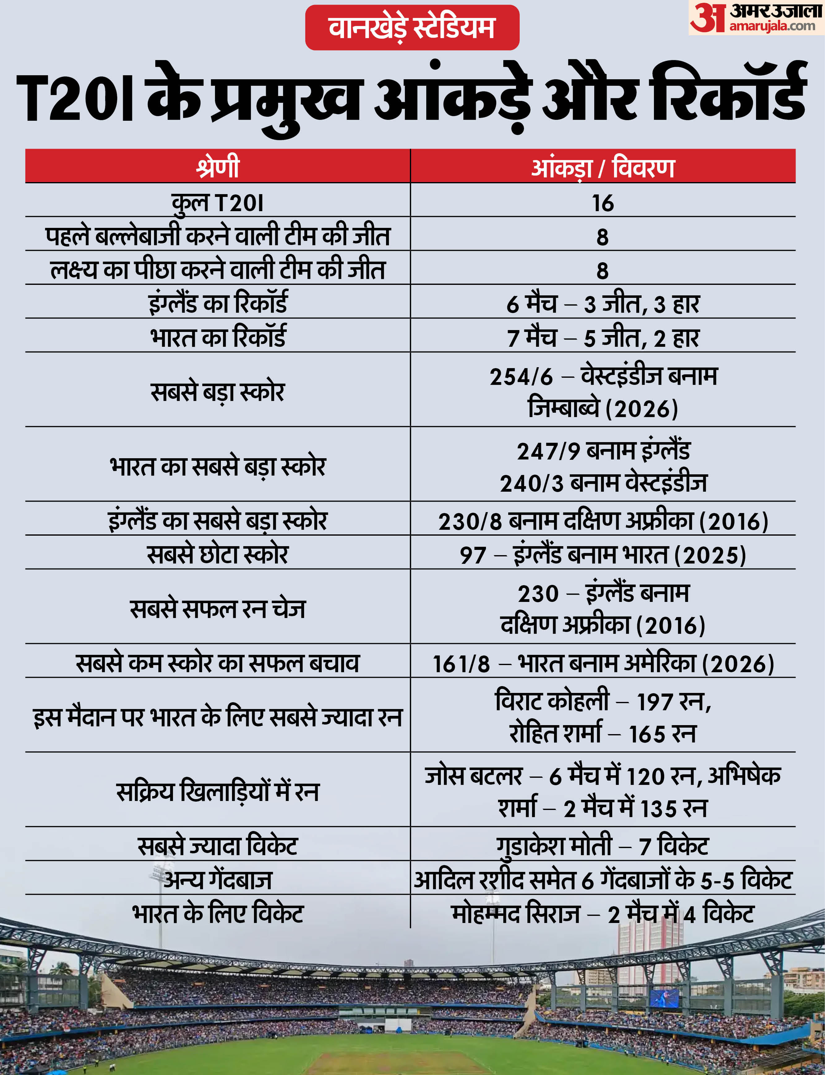 मुंबई का वानखेड़े स्टेडियम दुनिया के सबसे हाई-स्कोरिंग मैदानों में गिना जाता है। इसकी स्थापना 1974 में हुई थी। इस स्टेडियम में दर्शकों के बैठने की क्षमता करीब 32 हजार की है। यहां पहला टेस्ट साल 1975 में खेला गया था। जबकि पहला वनडे 1987 में खेला गया। इस मैदान पर पहला टी20 अंतरराष्ट्रीय मैच 2012 में खेला गया। यह मैदान पारंपरिक रूप से फ्लैट पिच और छोटी बाउंड्री के लिए जाना जाता है। यहां गेंद सीधे बल्ले पर आती है, जिससे बल्लेबाजों को बड़े शॉट खेलने में आसानी होती है। आईपीएल और टी20 अंतरराष्ट्रीय में छक्के-चौकों और रनों की बारिश होते हमने देखा है। यहां दोनों पारियों में बल्लेबाजों को बराबर की मदद मिलती है। यहां कोई भी बड़ा स्कोर बनाकर खुद को सुरक्षित महसूस नहीं किया जा सकता।