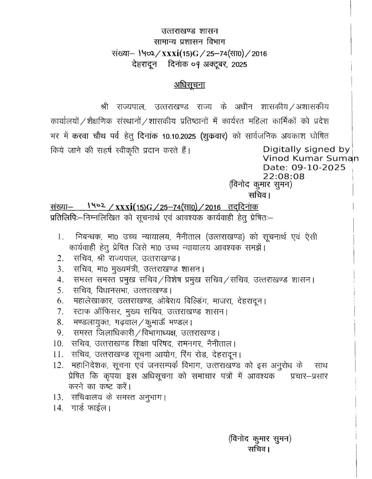 उत्तराखंड सरकार ने शुक्रवार को करवाचौथ के उपलक्ष्य में महिलाओं को सार्वजनिक अवकाश की सौगात दी है। सचिव विनोद कुमार सुमन की ओर से जारी आदेश के मुताबिक, शुक्रवार को करवाचौथ पर प्रदेश के सभी शासकीय, अशासकीय कार्यालयों, शिक्षण संस्थानों, शासकीय प्रतिष्ठानों में महिला कर्मियों के लिए सार्वजनिक अवकाश होगा।