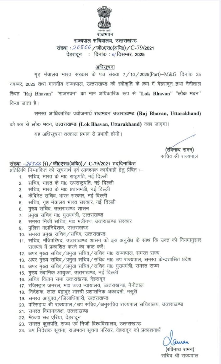Uttarakhand News: देहरादून और नैनीताल में राजभवन को अब लोक भवन के नाम से जाना जाएगा।