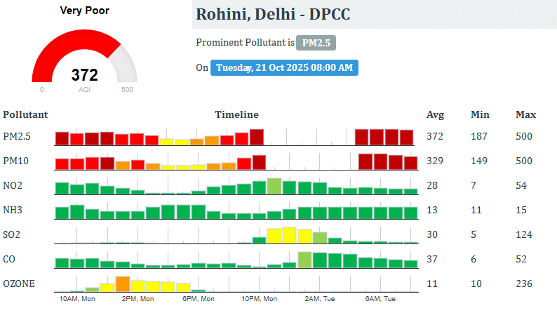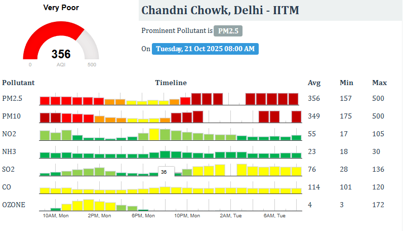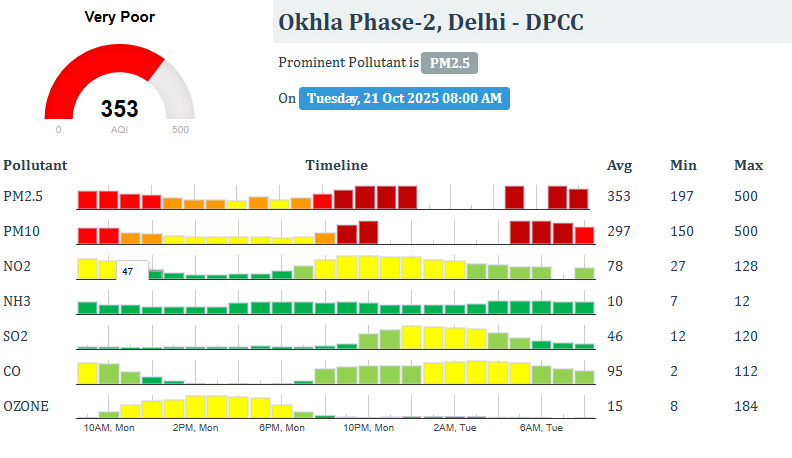 केंद्रीय प्रदूषण नियंत्रण बोर्ड (CPCB) के अनुसार, आज सुबह दिल्ली में इंडिया गेट के आसपास वायु गुणवत्ता सूचकांक (AQI) 342 दर्ज किया गया, जो 'गंभीर' श्रेणी में है। दिल्ली में अक्षरधाम के आसपास वायु गुणवत्ता सूचकांक (AQI) 358 दर्ज किया गया, जो 'बहुत खराब' श्रेणी में है। INA और AIIMS के पास भी हवा खराब है।