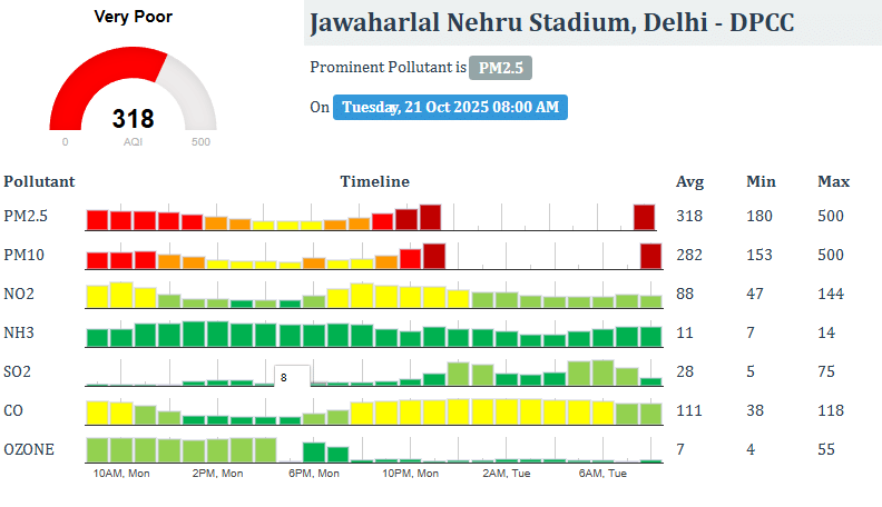 केंद्रीय प्रदूषण नियंत्रण बोर्ड (CPCB) के मुताबिक, दिल्ली में वायु गुणवत्ता ‘बहुत खराब’ और ‘गंभीर’ श्रेणी में है। मौजूदा वक्त में पूरी दिल्ली का एयर क्वालिटी इंडेक्स (AQI) 531 है। केंद्रीय प्रदूषण नियंत्रण बोर्ड (CPCB) के अनुसार, जवाहरलाल नेहरू स्टेडियम क्षेत्र के आसपास वायु गुणवत्ता सूचकांक (AQI) 317 दर्ज किया गया है।