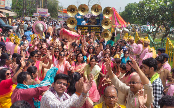 इंदिरापुरम में महावीर जयंती पर निकलती यात्रा में झूमते श्रद्धालु। संवाद