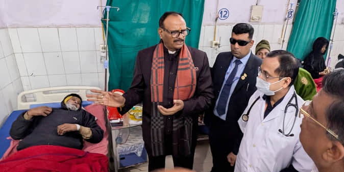 जिला अस्पताल में निरीक्षण के दौरान मरीज से बात करते उप मुख्यमंत्री ब्रिजेश पाठक। संवाद