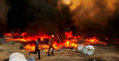 कनावनी गांव स्थित झुग्गियों में लगी आग से बचने के लिए भागते दमकलकर्मी व लोग। फोटो: नितिन कुमार