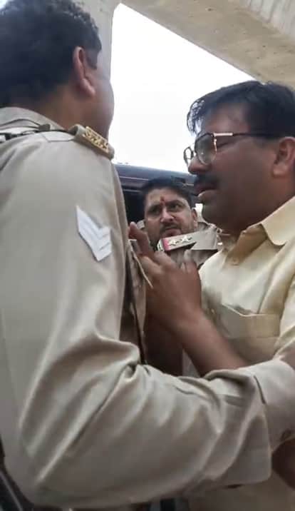 हिन्दू जागरण मंच के नेताओ और पुलिस में होती नोकझोंक। स्रोत: वीडियोग्रौब