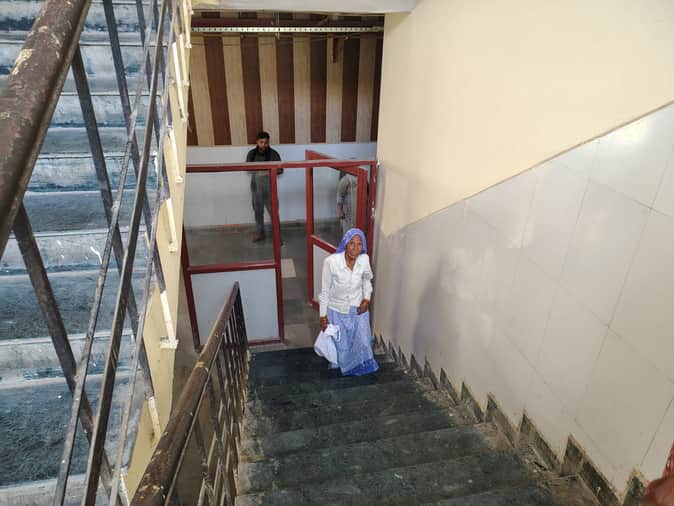 लिफ्ट खराब होने के कारण मजूबरी में सीढ़ियों का सहारा लेती बुजुर्ग महिला। संवाद