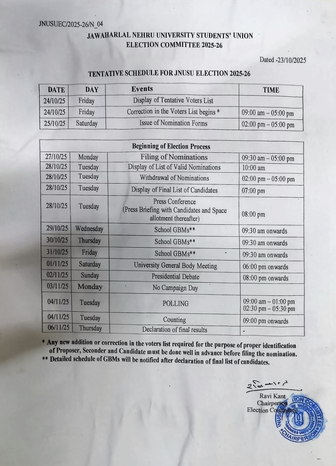 जवाहरलाल नेहरू विश्वविद्यालय यानी जेएनयू में चुनाव समिति ने शैक्षणिक सत्र 2025-26 के लिए छात्रसंघ चुनावों का विस्तृत कार्यक्रम जारी कर दिया है। जारी कार्यक्रम में बताया गया है कि इस बार मतदान 4 नवंबर 2025 को होगा, जबकि चुनाव परिणामों की घोषणा छह नवंबर को की जाएगी। यह घोषणा जेएनयू परिसर में चुनावी गहमागहमी को तेज करने वाली है।