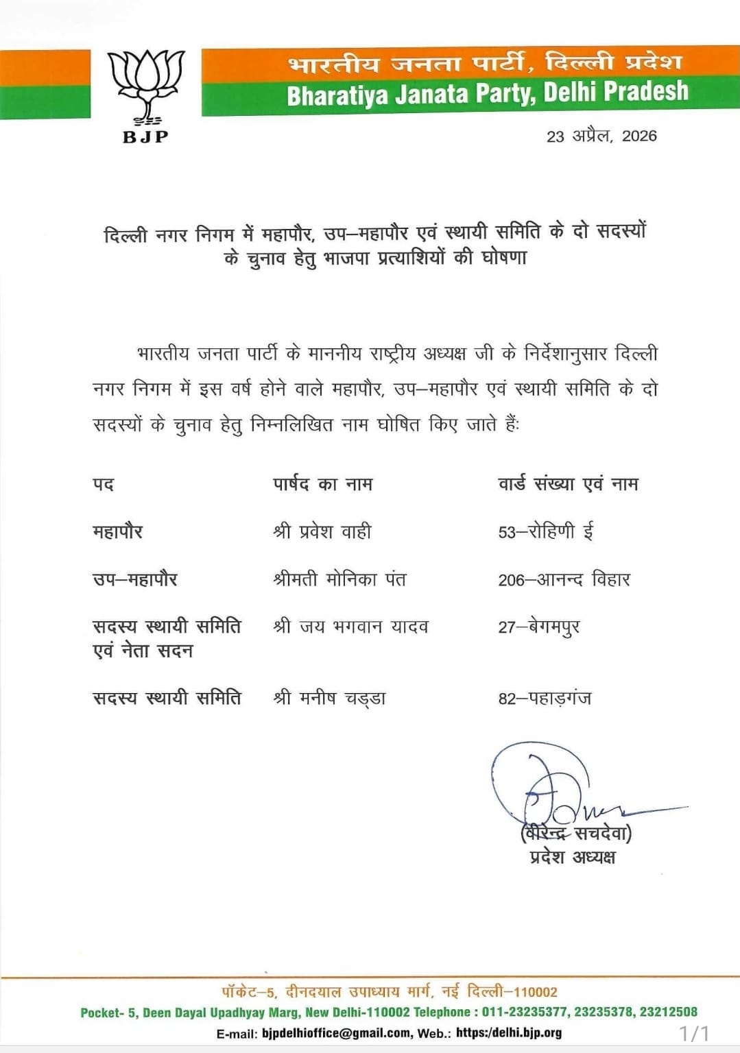 MCD: भाजपा ने महापौर, उप-महापौर के लिए प्रत्याशियों की घोषणा की, प्रवेश वाही पर जताया भरोसा, देखें पूरी सूची