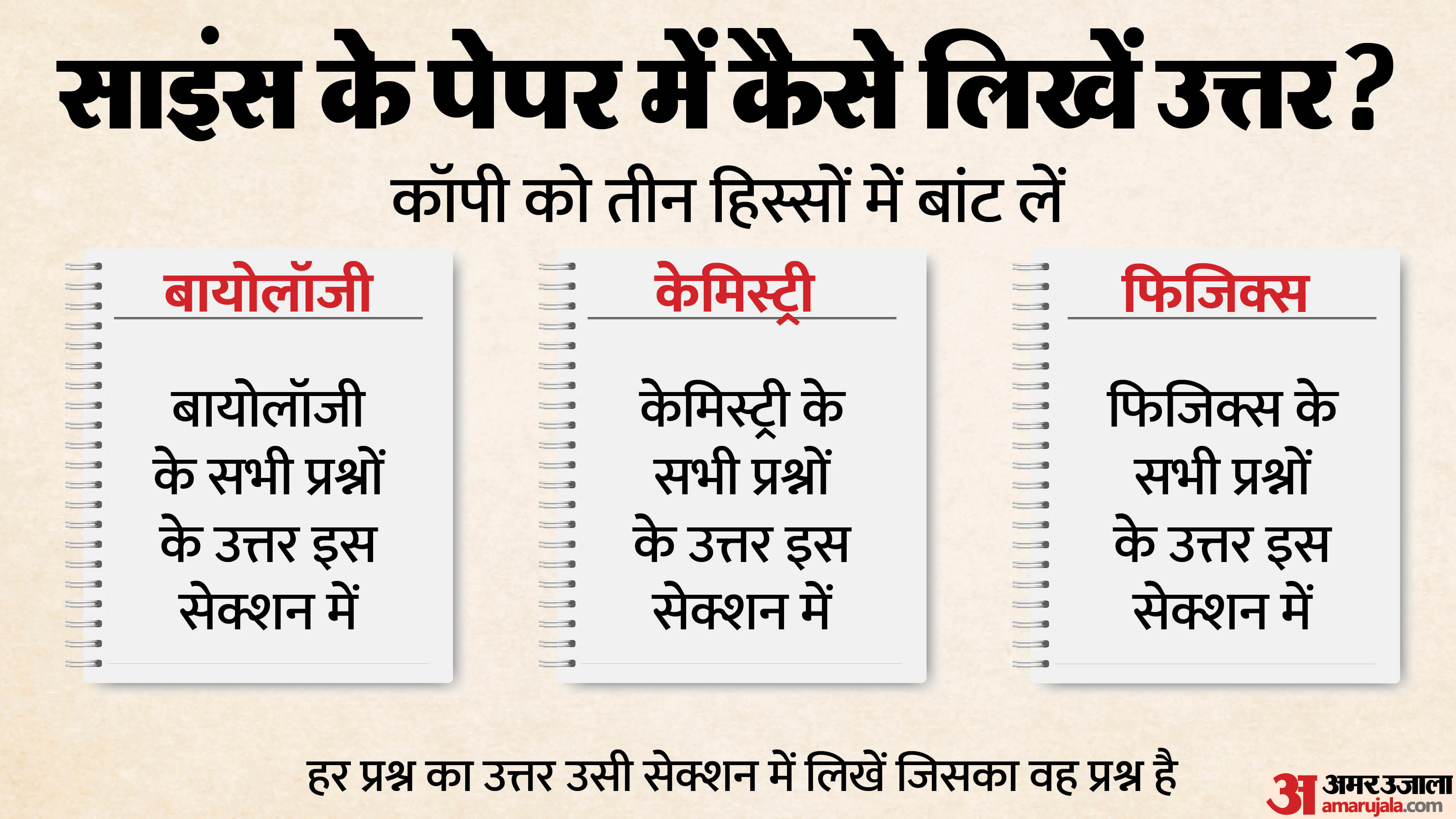 छात्रों को विज्ञान की परीक्षा में बायोलॉजी, केमिस्ट्री और फिजिक्स के लिए उत्तर पुस्तिका को तीन भागों में बांटना होगा। संबंधित सेक्शन का उत्तर उसी सेक्शन में लिखना होगा।