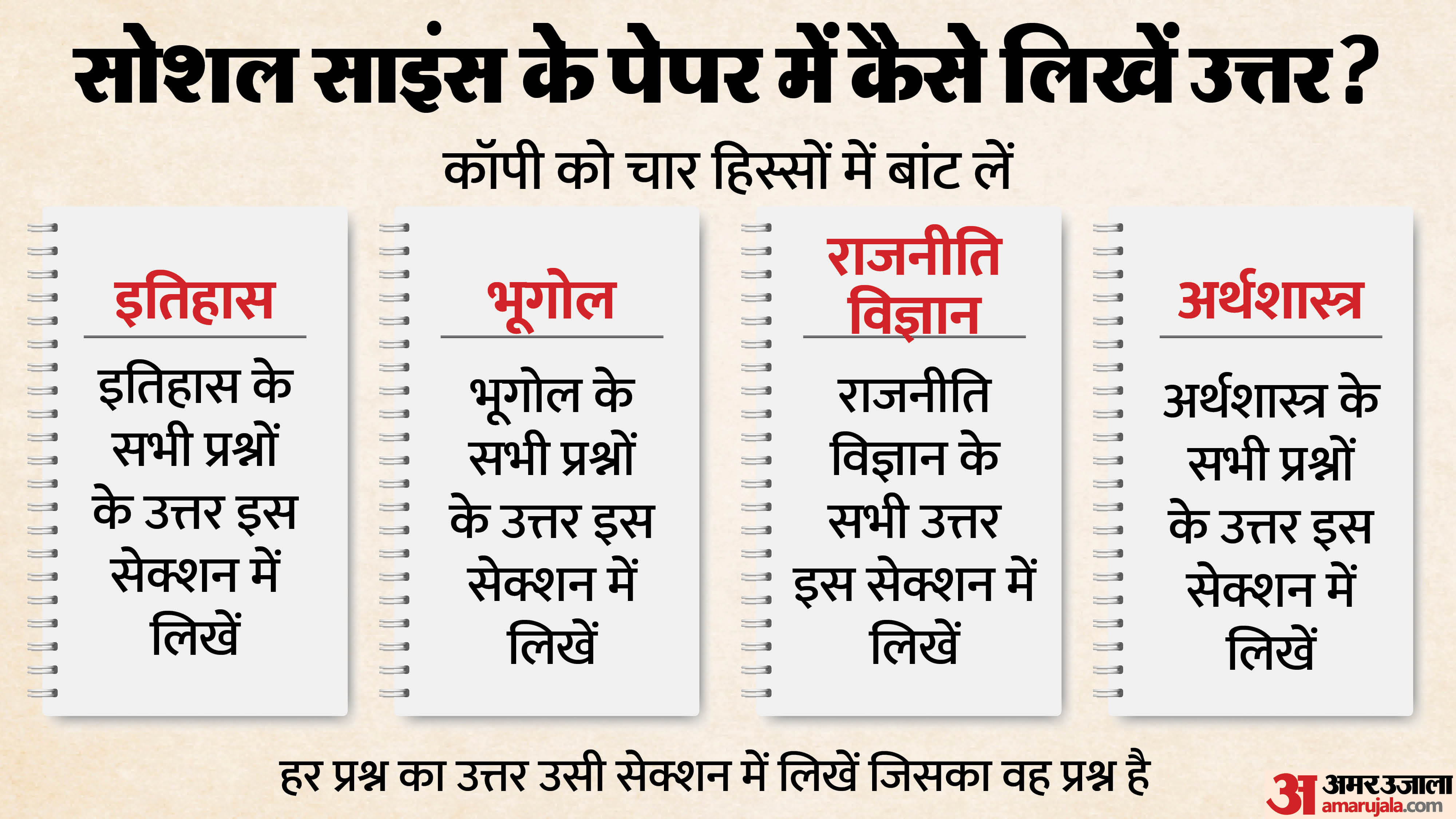 सोशल साइंस की परीक्षा में इतिहास, भूगोल, राजनीति विज्ञान और अर्थशास्त्र के लिए उत्तर पुस्तिका को चार भागों में बांटना होगा। विद्यार्थियों को हर प्रश्न का उत्तर उसी सेक्शन में लिखना होगा जिस सेक्शन का वह प्रश्न है।