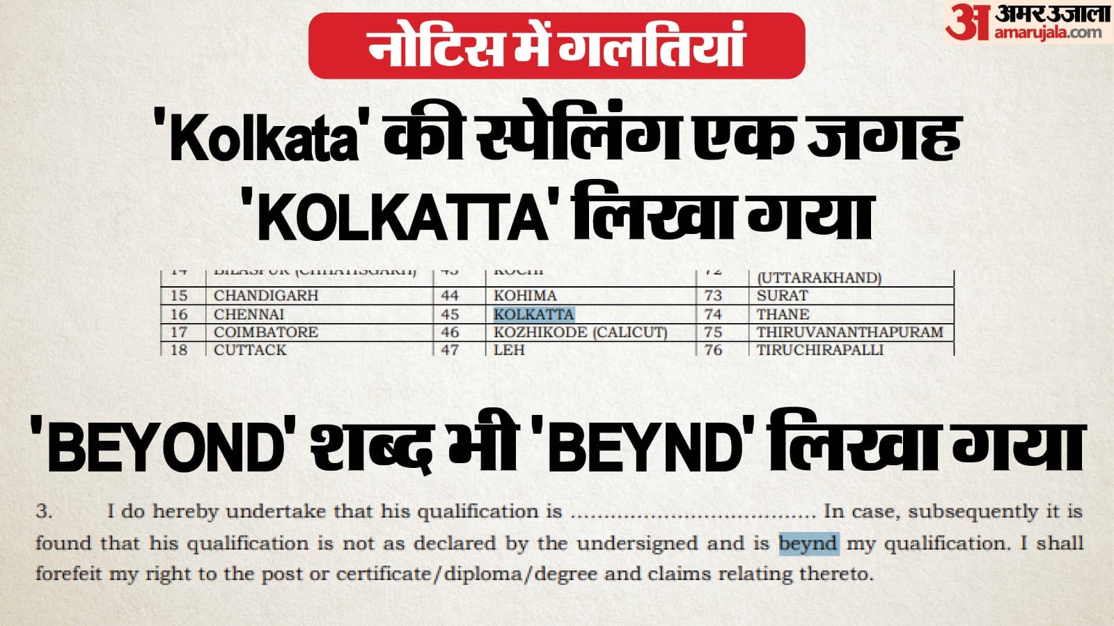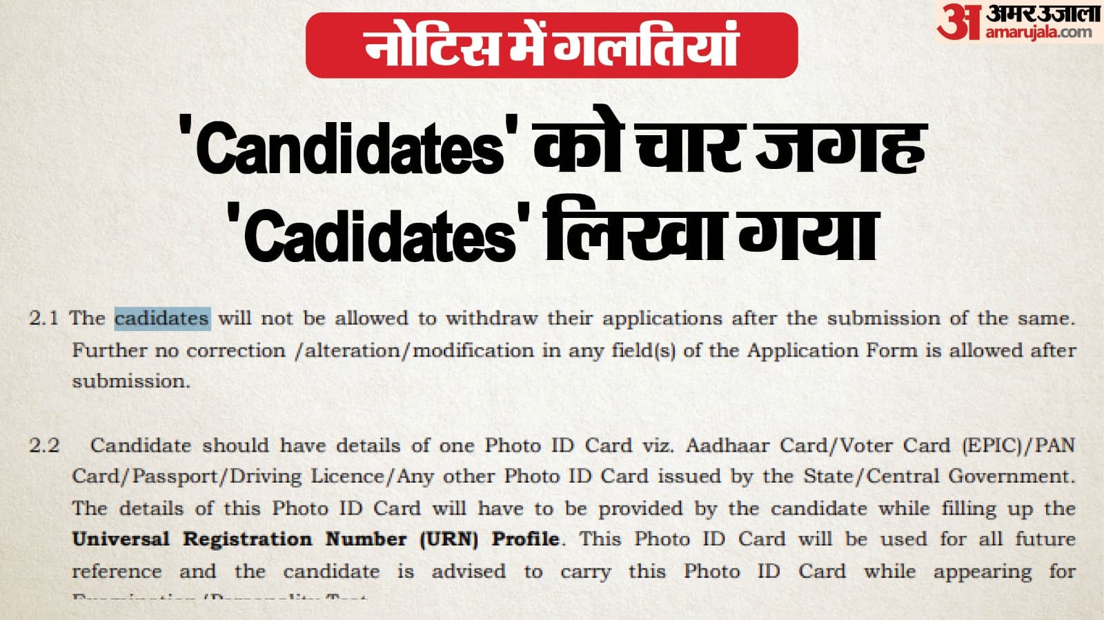 अभ्यर्थियों ने नोटिफिकेशन के अलग-अलग पेजों पर कई बड़ी त्रुटियां चिन्हित की हैं। उदाहरण के तौर पर  'Examination' शब्द को 'Examinaiton' लिखा गया है, जो 'How to Apply' सेक्शन समेत कई पन्नों पर नजर आया। इसी तरह 'Candidates' को भी चार जगह 'Cadidates' लिखा गया, जबकि पास ही सही स्पेलिंग भी मौजूद है, जिससे प्रूफरीडिंग में कमी का अंदाजा लगाया जा रहा है।