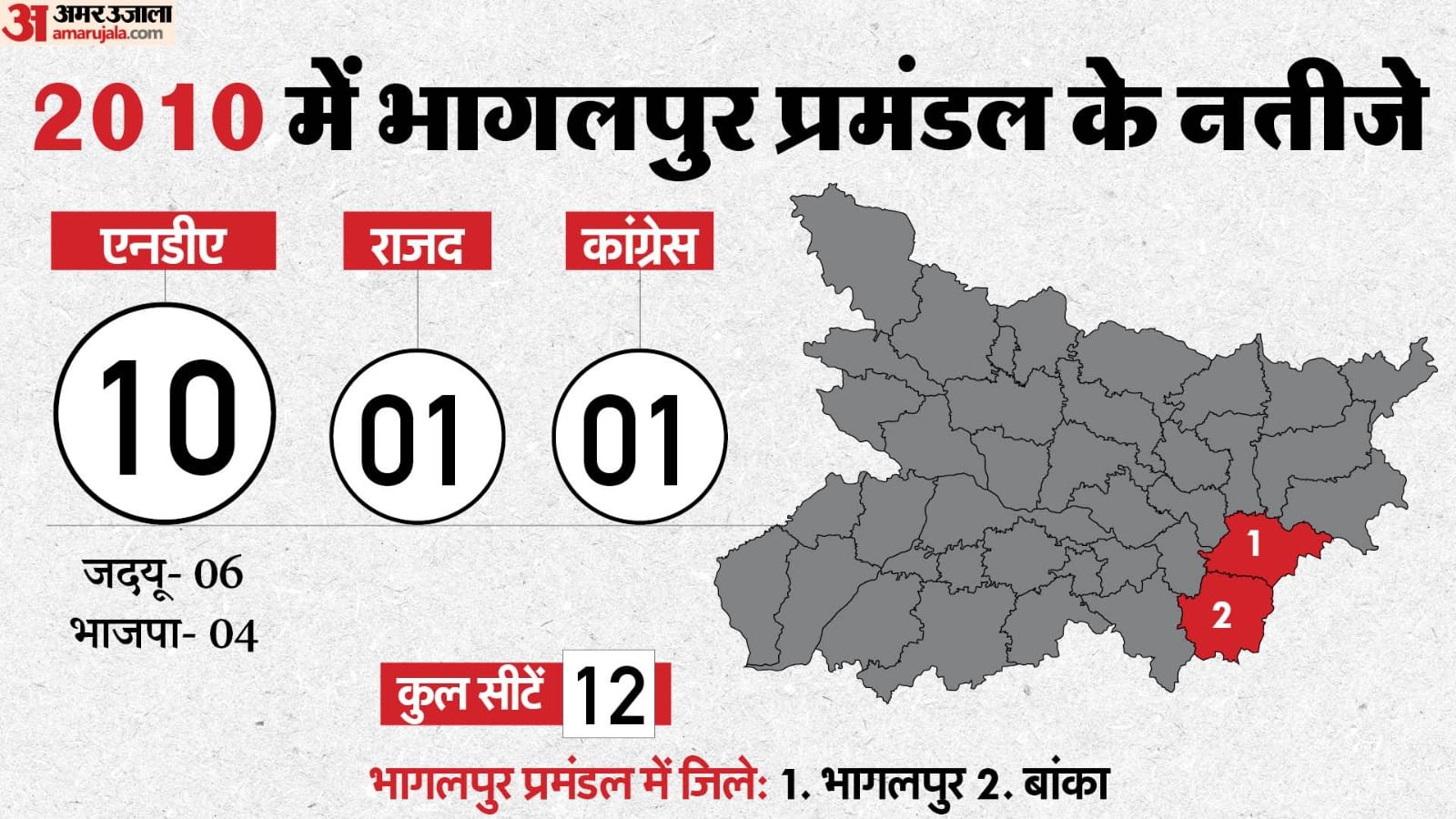 2010 में एनडीए को भागलपुर प्रमंडल में 12 में से कुल 10 सीटें हासिल हुईं। राजद को एक और कांग्रेस को एक सीट मिली थी। एनडीए में शामिल जदयू छह और भाजपा चार सीटें जीतने में सफल रही थी।