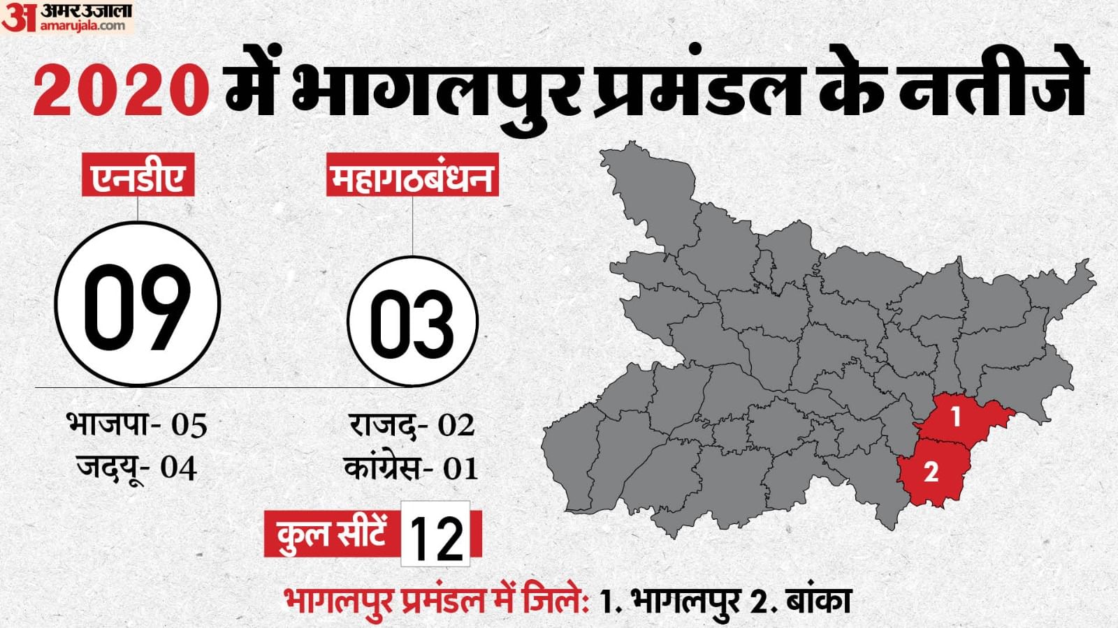 2020 के विधानसभा चुनाव में भागलपुर प्रमंडल में एनडीए ने सीधे महागठबंधन को मात दी। एनडीए को नौ और महागठबंधन को तीन सीटों पर जीत मिली। दलवार आंकड़ों की बात करें तो एनडीए में भाजपा को पांच और जदयू को चार सीटें मिलीं थीं। दूसरी तरफ महागठबंधन की राजद को दो और कांग्रेस को एक सीट मिली।