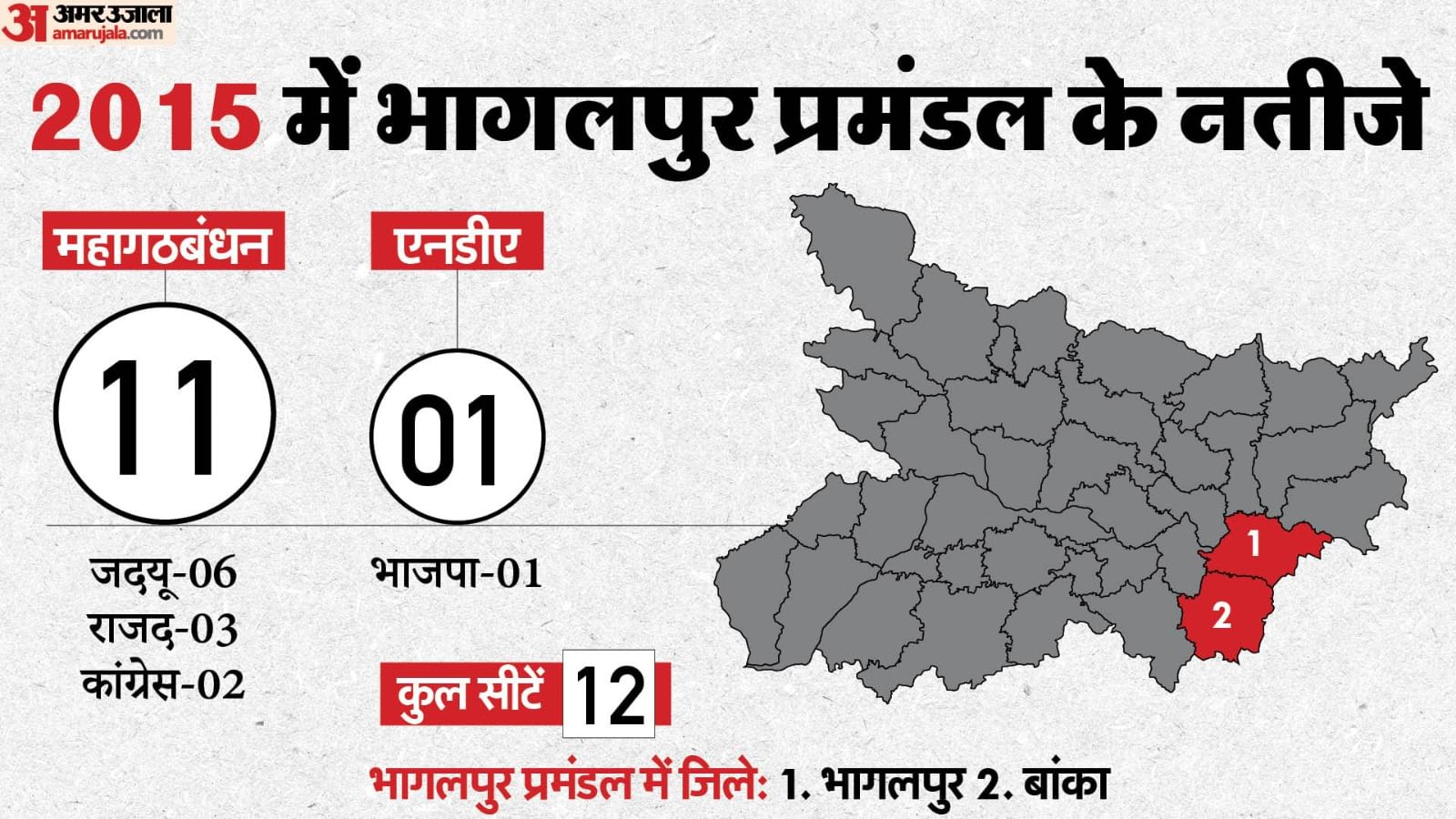 बिहार विधानसभा चुनाव का प्रचार चरम पर है। पहले चरण की वोटिंग के लिए एक हफ्ते भी नहीं बचे हैं। नौ प्रमंडल में बंटे बिहार में कहां कौन भारी पड़ता है ये 14 नवंबर को पता चलेगा। अमर उजाला की खास सीरीज में हम आपको बिहार में हर प्रमंडल के पिछले चुनावी नतीजों के बारे में बता रहे हैं। आज हम भागलपुर प्रमंडल की बात करेंगे। भालपुर प्रमंडल में दो जिले आते हैं। इसमें भागलपुर और बांका जिला शामिल है।