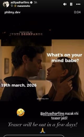शुक्रवार को आदित्य धर ने एक सोशल मीडिया स्टोरी के माध्यम से फैंस को हिंट दी है। एक फैन ने जब एक मीम शेयर करते हुए आदित्य धर से कहा कि अब मजाक नहीं, जल्दी टीजर जारी कीजिए। इस पर आदित्य धर ने इंस्टाग्राम स्टोरी शेयर करते हुए बताया कि फिल्म का टीजर जल्द ही रिलीज होगा।