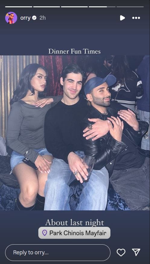 कुछ ही घंटों पहले ओरी ने अपने सोशल मीडिया प्लेटफॉर्म पर लंदन में पार्टी की खास तस्वीर साझा की हैं। इस तस्वीर में ओरी के साथ नीसा देवगन और आरव कुमार नजर आ रहे हैं। इस तस्वीर को देखकर लग रहा है कि यह लेट नाइट पार्टी की तस्वीर हैं। ओरी ने कुछ ही घंटों पहले अपने सोशल मीडिया स्टोरी पर आरव, नीसा और अपनी फोटो अपलोड की है। ओरी ने फोटो को शेयर किया और कैप्शन में लिखा, ''डिनर फन टाइम्स'' आगे ओरी ने लिखा, ''कल रात के बारे में'' इसके बाद ओरी ने उस चाइनीज रेस्टोरेंट का नाम भी लिखा है, जहां पर ये तीनों डिनर करने गए थे।