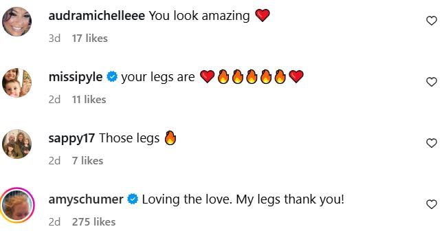 एमी शूमर की तस्वीर पर कमेंट करते हुए एक यूजर ने लिखा 'आप बहुत खूबसूरत और खुश लग रही हैं।' एक और यूजर ने लिखा 'आप कमाल की लग रही हैं।' एक दूसरे यूजर ने लिखा 'आपके पैर बहुत खूबसूरत लग रहे हैं।' कई अच्छे कमेंट देखने के बाद एमी शूमर ने अपने फैंस का शुक्रिया अदा करते हुए लिखा 'मुझे बहुत अच्छा लगा। मेरे पैर आपका शुक्रिया अदा करते हैं!'