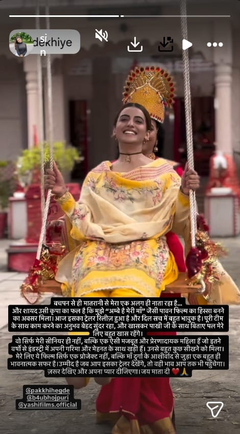 अक्षरा सिंह ने इंस्टग्राम पर एक पोस्ट शेयर कर ट्रेलर रिलीज पर खुशी जताई है। साथ ही लिखा है कि वे अपनी निजी जिंदगी में भी बचपन से ही माता रानी पर अटूट आस्था रखती हैं। अक्षरा ने लिखा है, 'बचपन से ही मातरानी से मेरा एक अलग ही नाता रहा है। शायद उसी कृपा का फल है कि मुझे 'अम्बे है मेरी मां' जैसी पावन फिल्म का हिस्सा बनने का अवसर मिला। आज इसका ट्रेलर रिलीज हुआ है। दिल भावुक है। पूरी टीम के साथ काम करने का अनुभव बेहद सुंदर रहा और खासकर पाखी जी के साथ बिताए पल मेरे लिए बहुत खास रहेंगे। वो सिर्फ मेरी सीनियर ही नहीं, बल्कि एक ऐसी मजबूत और प्रेरणादायक महिला हैं जो इतने वर्षों से इंडस्ट्री में अपनी गरिमा और मेहनत के साथ खड़ी हैं। उनसे बहुत कुछ सीखने को मिला। मेरे लिए ये फिल्म सिर्फ एक प्रोजेक्ट नहीं, बल्कि मां दुर्गा के आशीर्वाद से जुड़ा एक बहुत ही भावनात्मक सफर है'।