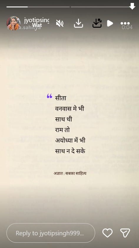 पति पवन सिंह की तीसरी शादी की अटकलों के बीच ज्योति सिंह ने आज गुरुवार को इंस्टाग्राम अकाउंट पर एक क्रिप्टिक पोस्ट शेयर किया है। उन्होंने एक पोस्टर शेयर किया है। इसमें लिखा है, 'सीता वनवास में भी साथ थी राम तो अयोध्या में भी साथ न दे सके'। इसके अलावा एक अन्य पोस्टर भी शेयर किया है। इस पर लिखा है, 'शिव का अपनाया हुआ अक्सर दुनिया से ठुकराया हुआ होता है'।