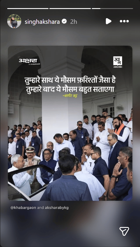 एक ओर जहां रवि किशन और मैथिली ठाकुर ने सम्राट चौधरी को बधाई दी। वहीं दूसरी ओर भोजपुरी अभिनेत्री अक्षरा सिंह की इंस्टाग्राम स्टोरी ने सभी का ध्यान अपनी ओर खींचा। अक्षरा ने नीतीश कुमार की एक तस्वीर साझा की, जिसमें वो गाड़ी में बैठने से पहले सभी को हाथ जोड़कर नमस्कार कर रहे हैं। इस दौरान सम्राट चौधरी भी हाथ जोड़े खड़े हैं। इस तस्वीर के साथ अक्षरा ने बशीर बद्र का एक शेर भी लिखा है-