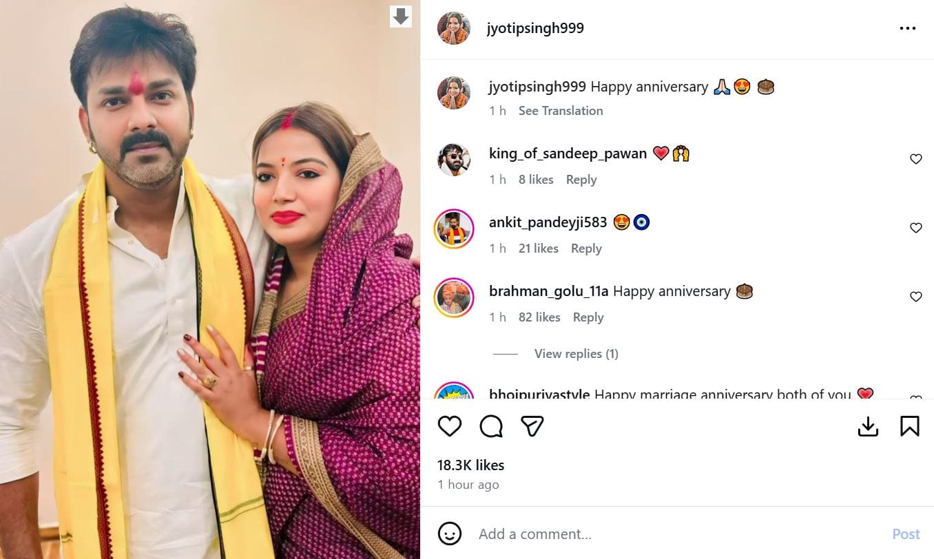 ज्योति सिंह के इस पोस्ट पर उनके और पवन सिंह के चाहने वालों ने कमेंट्स की झड़ी लगा दी है। यूजर्स शुभकामनाएं दे रहे हैं और साथ ही दुआ कर रहे हैं कि जल्द ही दोनों के बीच की दूरियां खत्म हों। साथ ही परिवार में विस्तार की कामना कर रहे हैं। एक यूजर ने लिखा है, 'आप लोग जल्दी से एक हो जाएं और छोटा पावर स्टार हमारे बीच हो, यही दुआ है'।