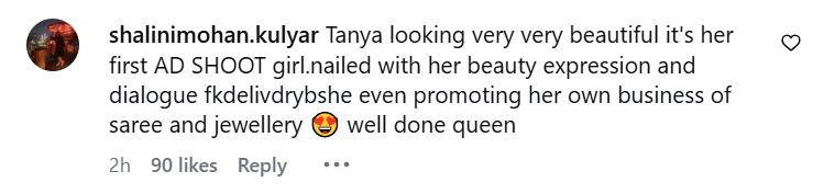 हालांकि, कई यूजर्स ने तान्या की तारीफ भी की है। एक नेटिजन ने कमेंट किया, ‘तान्या बेहद खूबसूरत लग रही हैं, यह उनका पहला एड शूट है। उन्होंने अपनी खूबसूरती, हाव-भाव और डायलॉग से कमाल कर दिया है। वह अपने साड़ी और ज्वेलरी के बिजनेस को भी प्रमोट कर रही हैं। शाबाश क्वीन।’ जबकि उनके कुछ और फैंस ने उनकी खूबसूरती की तारीफ करते हुए उन्हें बॉस कहकर संबोधित किया है।