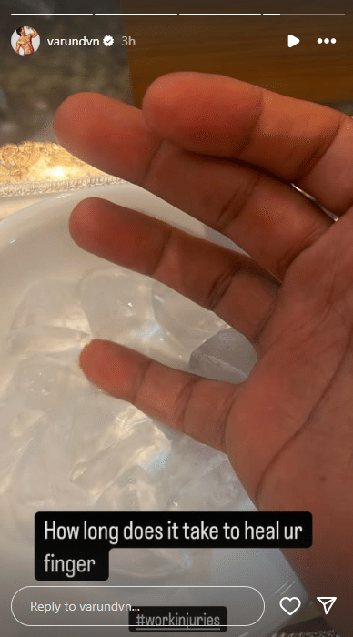 वरुण धवन को शूटिंग के दौरान चोट लग गई है, जिसकी जानकारी उन्होंने अपने इंस्टाग्राम पर एक स्टोरी शेयर कर दी है। अभिनेता ने बुधवार को स्टोरी के जरिए बताया कि उन्हें उंगली में चोट लग गई है। साथ ही उन्होंने अपने प्रशंसकों से सवाल किया कि आपकी उंगली को ठीक होने में कितना समय लगता है। इसके अलावा वरुण ने लिखा कि हैशटैग काम के दौरान की चोट। इस तस्वीर में उनकी उंगली में सूजन दिखाई दे रही है।