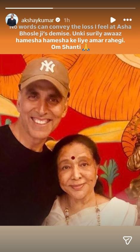 अक्षय कुमार ने आशा भोसले के निधन पर दुखा जताया है। उन्होंने गायिका के साथ तस्वीर शेयर करते हुए लिखा है 'आशा भोसले के निधन पर मैं जो मससूस कर रहा हूं उसे शब्दों में नहीं बयां किया जा सकता। उनकी सुरीली आवाज हमेशा अमर रहेगी।'
