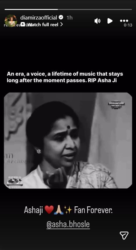 दीया मिर्जा ने आशा भोसले का एक वीडियो शेयर करते हुए लिखा है 'एक जमाना, संगीत का ऐसा संसार जो पल बीत जाने के बाद भी लंबे समय तक बना रहता है, वो गुजर गया। आशा जी को श्रद्धांजलि।'