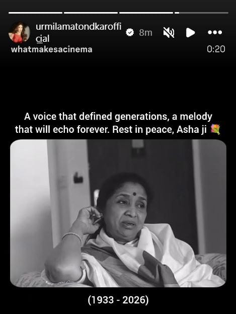 उर्मिला मातोंडकर ने आशा भोसले की एक तस्वीर शेयर करते हुए उन्हें श्रद्धांजलि दी है।