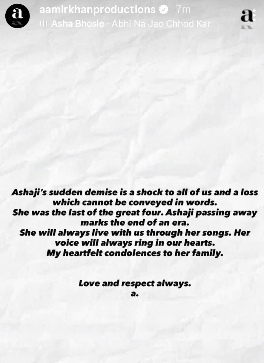 आमिर खान ने आशा भोसले के निधन पर दुख जताया है। उन्होंने एक पोस्ट में लिखा है 'आशा जी के निधन ने हम सबको हैरान कर दिया है। इस नुकसान को शब्दों में बयां नहीं किया जा सकता है। आशा भोसले का जाना एक युग का अंत है। वह अपने गानों के जरिए हमेशा हमारे साथ रहेंगी। उनकी आवाज हमेशा हमारे दिलों में रहेगी।'