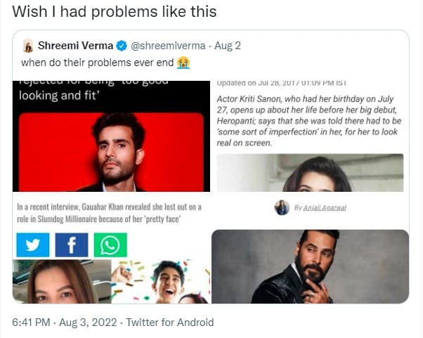 बॉलीवुड अभिनेत्री कृति सेनन ने एक इंटरव्यू के दौरान जिक्र किया था कि उन्हें लुक्स के चलते कई बार रिजेक्शन का सामना करना पड़ा है। वहीं, गौहर खान ने बताया था कि उन्हें स्लमडॉग मिलियनेयर के पांच ऑडिशन राउंड क्लीयर करने के बाद अच्छे दिखने के चलते रिजेक्ट कर दिया गया था। इसके अलावा डीनो मोरिया के साथ भी ऐसा ही हुआ था। अब सोशल मीडिया पर इन सितारों की खिल्ली उड़ाई जा रही है। एक ने कमेंट कर लिखा, 'मुझे भी ये दिक्कत अपनी जिंदगी में चाहिए', तो दूसरे ने लिखा, 'देखो इन गुड लुकिंग लोगों का स्ट्रगल।' एक ने कहा दिया कि अनन्या पांडे इसी स्ट्रगल की बात कर रही थीं।