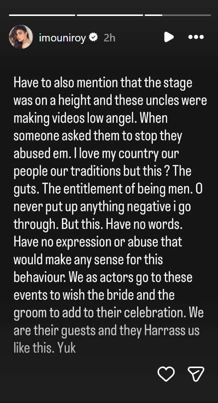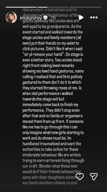मौनी ने अपने इंस्टाग्राम पर एक स्टोरी साझा की है। मौनी ने इंस्टाग्राम पर दो स्टोरी साझा की हैं। इनमें उन्होंने लंबे नोट के साथ अपने साथ हुए हादसे का जिक्र किया है। एक्ट्रेस ने लिखा, ‘पिछले दिनों करनाल में एक कार्यक्रम था और मेहमानों के व्यवहार से मैं बेहद निराश हूं। खासकर उन दो अंकल लोगों के व्यवहार से जो दादा-दादी की उम्र के हैं। जैसे ही कार्यक्रम शुरू हुआ और मैं मंच की ओर बढ़ी, अंकल और परिवार के सदस्यों सभी पुरुष ने तस्वीरें खींचने के लिए मेरी कमर पर हाथ रख दिया। जब मैंने कहा 'सर, कृपया अपना हाथ हटा लें', तो मुझे यह बिल्कुल पसंद नहीं आया।’